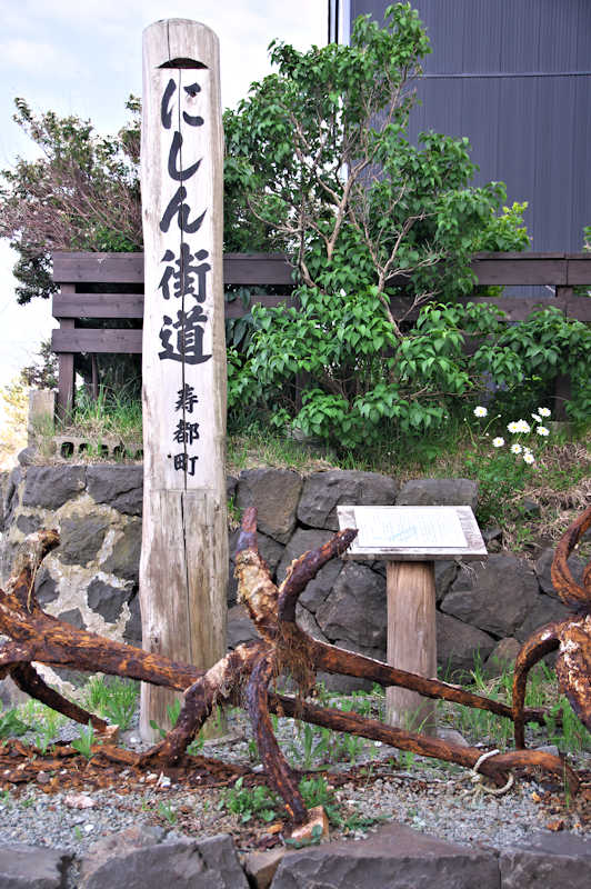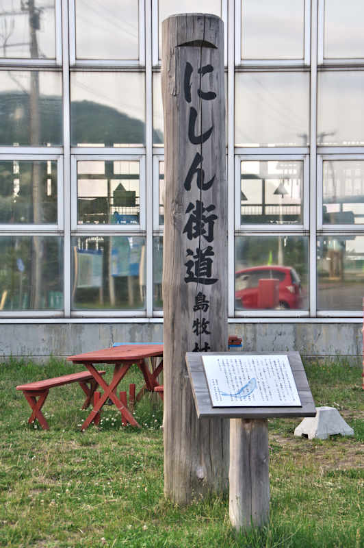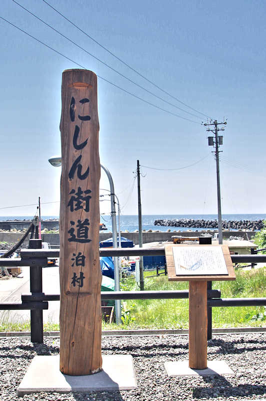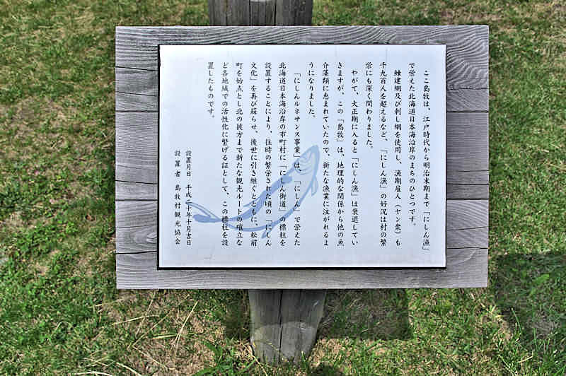 ここに、松前を始点とし、北の彼方まで「にしん漁」で栄えた日本海沿岸の市町村に「にしん街道」の標柱を設置しようという「にしんルネサンス事業」の一環として、また、往時を偲ぶ文化遺産を後世に引き継ぐとともに、地域の活性化を繋げる証として、この標柱を設置しました。』◇設置年:平成21年7月吉日 ◇設置者:泊村観光協会 ◇所在地:泊村大字泊村59番地1 ◇G.Map:43.067787, 140.492795