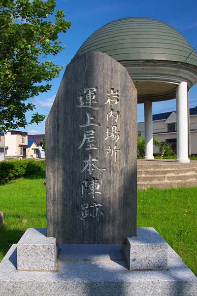 松前藩は失政による財政破綻を民間丸投げ(場所請負)という形での財政再建をはかった。海産物資源の交易拠点を場所請負人に管理をさせることになり、初代の場所請負人は近江商人・恵美須屋(岡田)弥三右衛門(年代から6代目弥三右衛門?)で、岩内場所を請負した宝暦元(1751)年を岩内の開基年としているようです。幕末の岩内場所請負人は仙北屋・佐藤仁左衛門で、にしん街道はかつては場所請負人によって開かれ、漁場運営がされてきた。1869年に場所請負制度が廃止され、官営事業となるに伴い運上屋は本陣に、番屋、止宿所、通行屋が同所にある場合、運上屋以外を脇本陣と称した。官営は短命で終わり本陣(運上屋)も廃止されるが、駅逓として継続する所もあった。本陣の名称は明治初期の駅逓を示唆する旧跡ともいえるが、明治初期には一帯が運上屋の建物で占められていたというが、今は碑があるのみ。岩内郷土館にはニシン漁と運上屋に関する資料が残されている。◇所在地:岩内町万代 ◇G.Map:42.983526, 140.510781