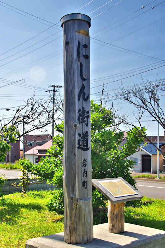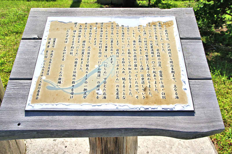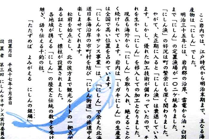 「にしんルネサンス事業」は、「にしん」で栄えた北海道日本海沿岸の市町村に「にしん街道」の標柱を設置することにより、往時の繁栄された頃の「にしん文化」を再び蘇らせ、後世に引き継ぐとともに、松前町を始点とし北の彼方まで新たな観光ルートの確立など各地域での活性化に繋げる証として、この標柱を設置したものです。』