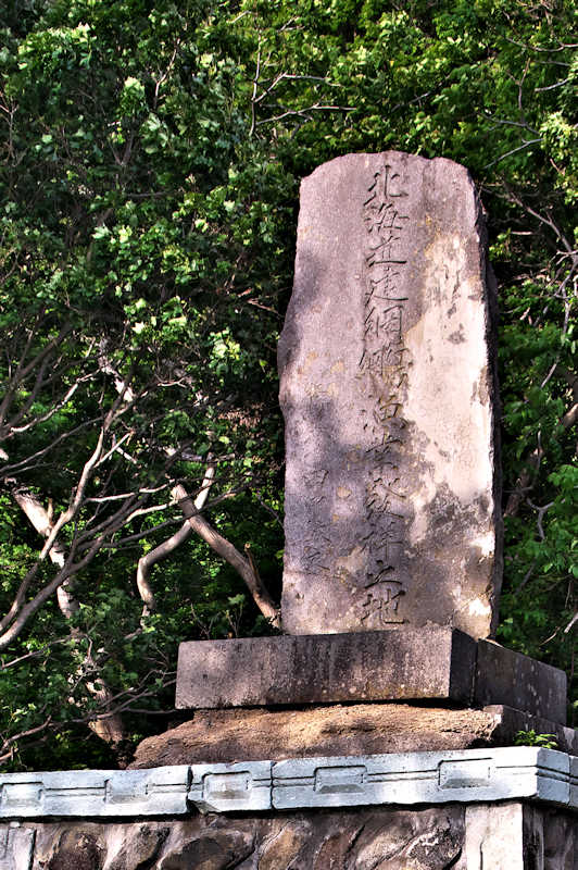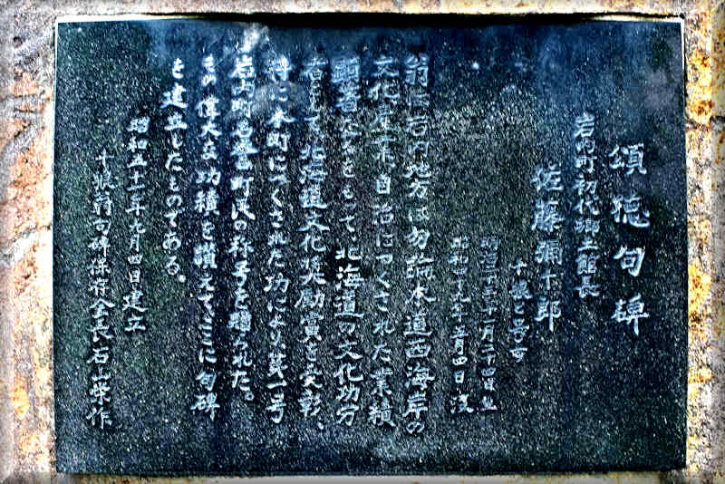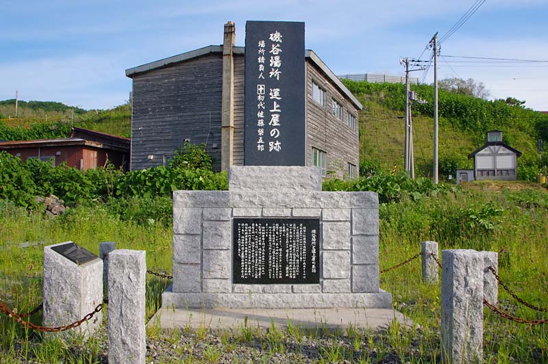カクジュウ佐藤家から40mの所にある碑。磯谷場所請負人佐藤伊三右衛門が発明した定置網の元祖といえる漁法でニシン漁法に革命を与え、ニシン黄金時代を築いた記念碑。別な見方をすると産卵期のニシンを一網打尽にする漁法のはじまりとなった。碑のすぐ近くに荒れたカクジュウ佐藤家の邸内社がある。