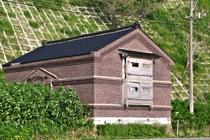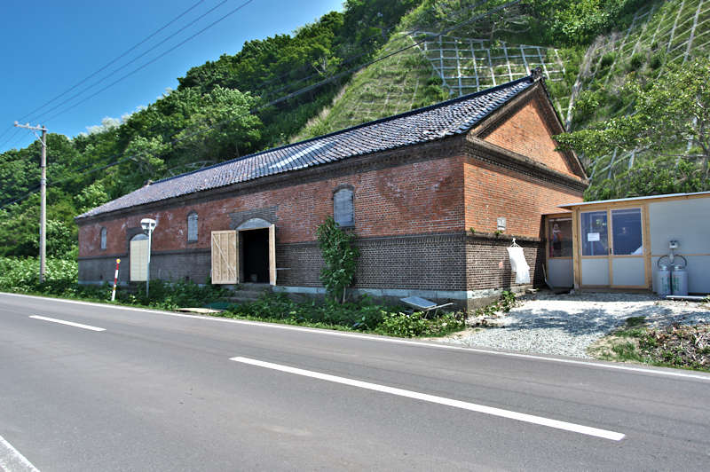 二つの煉瓦蔵が少し距離をあけて建っている。かつて煉瓦蔵の間に主屋である番屋が建っていた事による距離で、煉瓦蔵を左右に配した主屋であった鰊番屋は相当な大きな建物であったと想像出来るが、切妻屋根の番屋であったということだ。海に対して直角の位置取りで建っている煉瓦蔵は開口部の雰囲気によるのか、煉瓦造でありながら和風のイメージがある。この煉瓦蔵は貴重品を収蔵する用途に使われていたという。 海と並行に崖の間の狭小な敷地に建てられている蔵は建物自体の広さがあるので製品の保存に使われたのであろうか、同じ煉瓦蔵でも受ける印象は全くことなるが、両方の蔵は1980年代の竣工という。旧岡田家は近江八幡の商人で松前に進出し屋号を「恵比須屋」とし、のちに松前を拠点に場所請負人として漁場経営も手がけている。幕末期(第10代)には石狩・小樽内・古平・古宇・美国・岩内・礼文・利尻など23場所を請負っていたが、場所請負制度廃止で岡田家12~13代のとき北海道の開発事業に手を広げるが経営破綻(明治34年)し破産。話は変わるが寿都空襲で被弾した東海丸の乗組員が煉瓦蔵に一時収容されたという歴史がある。◇撮影地:寿都郡寿都町歌棄町種前 ◇G.Map:42.809239, 140.304869