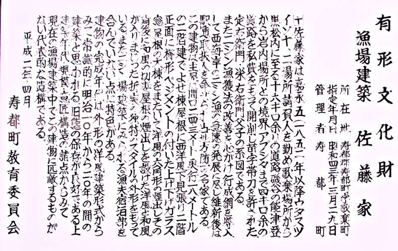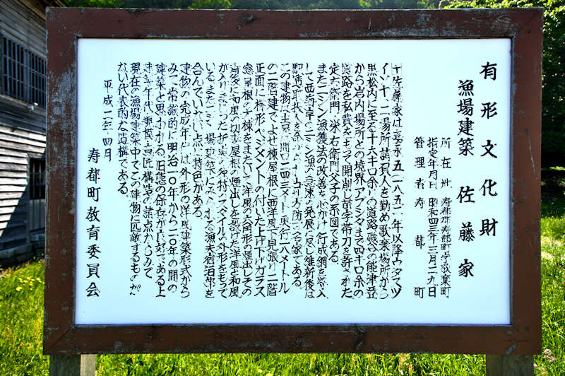 明治初期に建てられた代表的な漁場建築ですが内部は非公開、外観を見るだけなら可能。説明板より転載する「有形文化財 漁場建築 佐藤家 所在地 寿都郡寿都町字歌棄 指定年月日 昭和43年3月29日 管理者 寿都町 角十(屋号)佐藤家は嘉永5(1852)年以降ウタスツ、イソヤ二場所の場所請負人を務め歌棄場所から黒松内に至る16キロ余りの道路、磯谷の能津登から岩内場所との境界アブシタまで4キロ余りの道路を私費をもって開削し苗字帯刀を許された。定右衛門・栄右衛門父子の系図である。またニシン漁獲法の改善を心がけ行成網(ゆきなりあみ)を導入して西海岸のニシン漁の急速の発展に尽し維新後は駅逓取扱人を命ぜられ当地方随一の名家である。この建物は母屋は間口24.3メートル奥行18メートルの2階建でよせ棟屋根に西洋風下見張り2階正面に櫛形ペジメントの付いた上げ下げガラス窓、屋根の大棟をまたいで洋風の六角形の煙出し、その背後に和風の切妻屋根の煙出しを設けた洋風と和風が入り交じった折衷の独特のスタイルの外形をもっている。またニシン場建築に見られる漁夫宿泊部を含んでいない点に特色がある。建物の完成年代は外形の洋風建築形式からみて明治10年から20年の間の建築と思われる。旧態の保存が良好である上、建築年代・規模・意匠・構造の諸点からみて現在の漁場建築中でこの建物に匹敵するものがない代表的な遺構である。平成2年4月 寿都町教育委員会」和洋折衷様式で内部は内部総桧材、漆塗りと漁場建築では他に聞いた事もない。ニシン場時代の資料や文献が大切に保管されているとの事。建物を含む旧歌棄佐藤家漁場が国史に指定されたので将来的には公開されるかも。◇所在地:寿都町字歌棄町有戸 ◇G.Map:42.789343, 140.308550