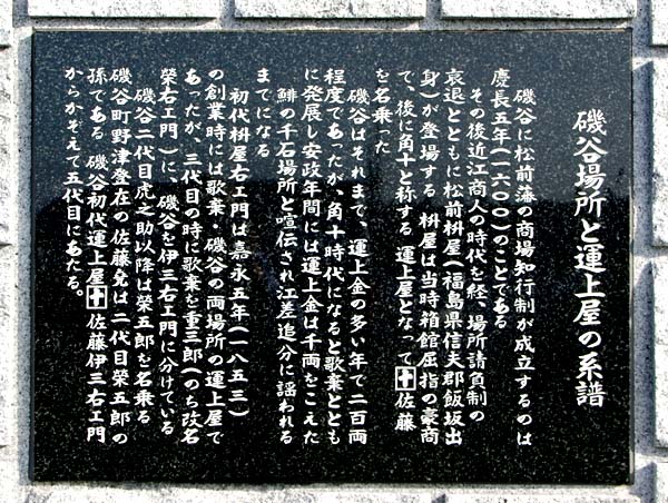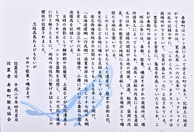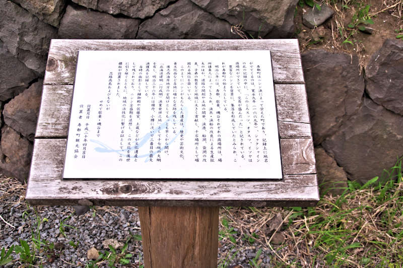 説明板より転載!!『寿都町はニシン漁によって栄えた町であり、記録上に地名がでてくるのは、寛永9(1669)年、シャクシャインの乱の記録の中に「このころスッツ、オタスツ、イソヤは商場所ができていて、交易が盛んだった」と記されている。