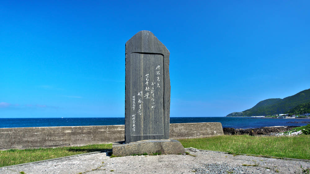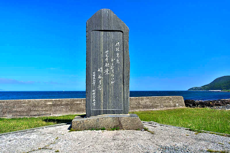 碑には「忍路高島およびもないがせめて歌棄磯谷まで」と有名な一節が刻まれている。その歌棄の稲穂崎という小さな出岬に碑が建っており協賛者60名の名前は記されているが、建立由来が記されていない。追分記念碑にまつわる裏話・当時の新興商人(政商)が何とか歌棄(有戸付近)と磯谷(横間付近)場所請負の権利を手に入れたが、年々北上するニシン漁場ということから、何とかして忍路・高島の場所請負の権利を手に入れようと暗躍したが、事破れて全面的な敗退となった。そのことを書いた落札が喝采を受け歌詞になったのだというが、表には出てこない。道路を挟んで向かいは歌棄鰊御殿、稲穂崎横の石積みの護岸はかつての船着場跡、稲穂崎の先端部にあるのは恵比寿神社。◇建立年:昭和40年9月26日 ◇建立者:不明 ◇所在地:寿都町字歌棄町有戸 ◇G.Map:42.781767, 140.306665