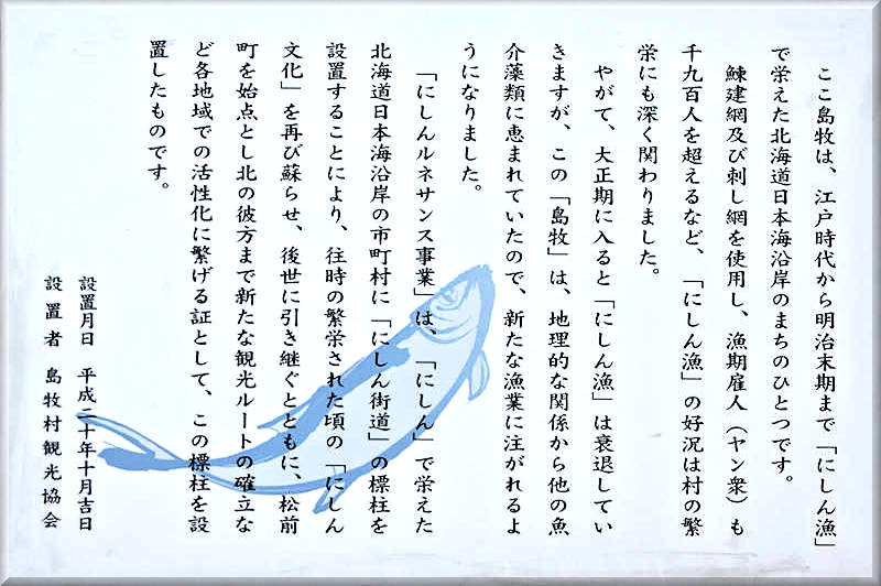 日本海沿岸の市町村には、袋澗をはじめ、鰊御殿やにしん漁の際に唄われた沖揚音頭、また各種資料館等には写真や漁具など、当時の様々な文化や資料がたくさん残されており、北海道の歴史の1ページ築きあげた時代を窺うことができます。「にしん街道」で結ばれた地域にある先人達が残した歴史や大切にし、後世に引き継ぐと共に、地域の活性化につなげる証として、この標柱を設置するものです。』