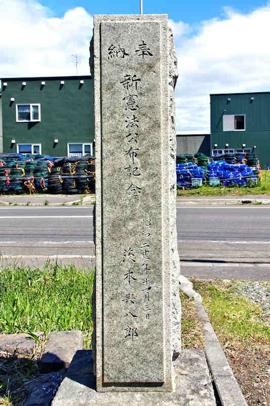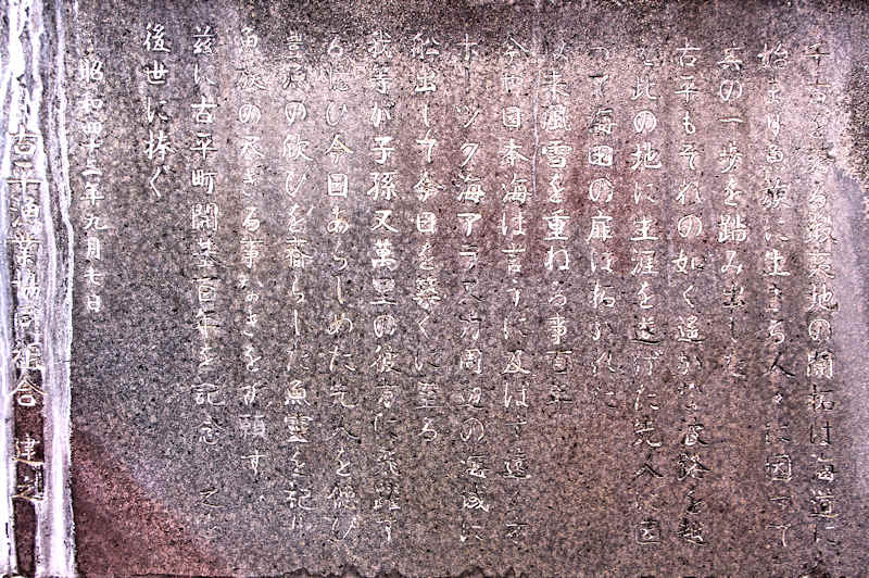古平漁協前に立ってる大きな碑で「千古を誇る蝦夷地の開拓は海道に始まり魚族に生きる人々に因って一歩を踏みだした」の碑文で始まる古平町開基100年の記念碑。鰊で栄えた町らしいと云えばそれまでだが、開基、発祥、開拓と名のつく記念碑は和人の歴史が全てであるかの様な碑文が多い。北海道では漁業の多くが場所請負という植民地経営方式で開拓されアイヌ民族の酷使を伴った歴史がある。農業では各地で農耕最適地からアイヌ民族を追い出した強制移住の歴史がある。敗者の歴史は埋もれていくがアイヌ語由来の地名を名乗っているのが唯一の救いか。◇建立年:昭和43年 ◇建立者:古平漁業協同組合 ◇所在地:古平郡古平町港町 古平漁協前 ◇G.Maps:43.271607,140.637209