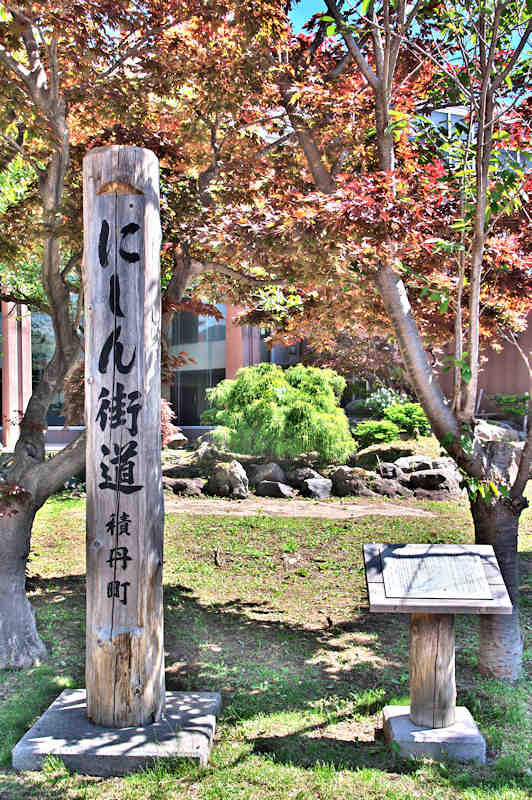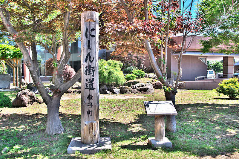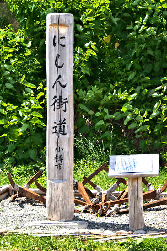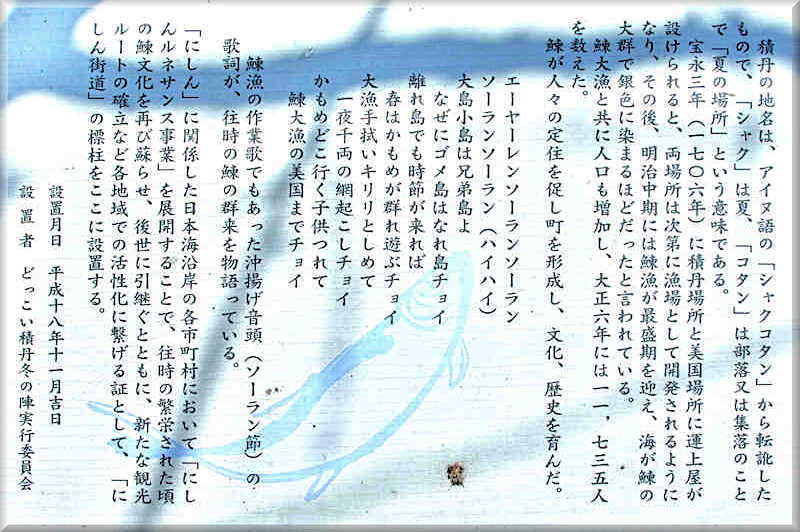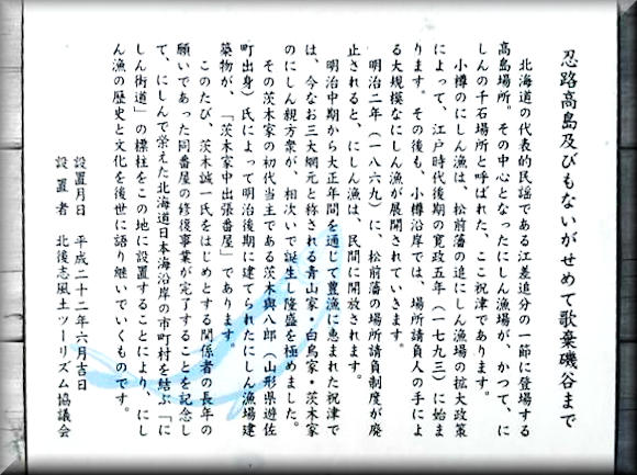 鰊漁の作業歌でもあった沖揚げ音頭(ソーラン節)の歌詞が、往時の鰊の群来を物語っている。「にしん」に関係した日本海沿岸の各市町村において「にしんルネサンス事業」を展開することで、往時の繁栄された頃の鰊文化を再び蘇らせ、後世に引継ぐとともに、新たな観光ルートの確立など各地域での活性化に繋げる証として「にしん街道」の標柱をここに設置する。』◇設置年:平成18年11月吉日 ◇設置者:どっこい積丹冬の陣実行委員会