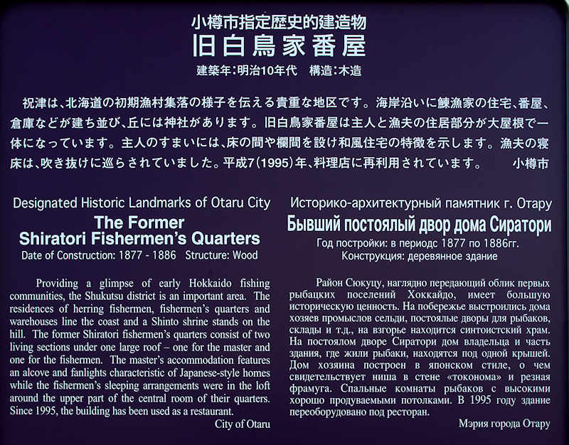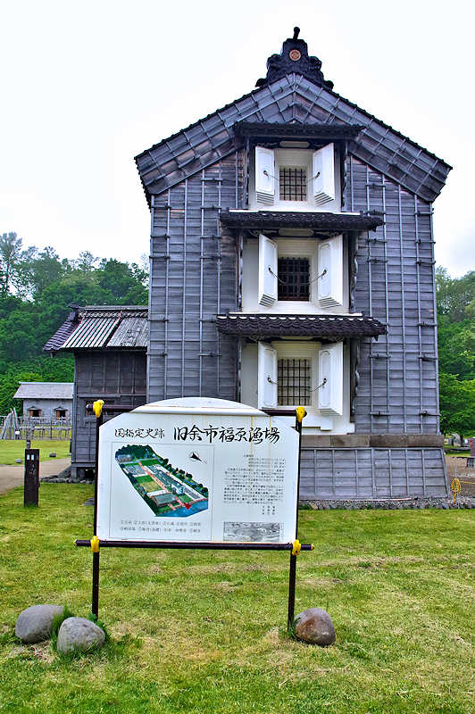 幕末からニシン漁を行っていた福原家が所有していた建物群です。以下は説明板より転載「史跡指定 昭和57年2月12日(10.732.17㎡)/史跡指定 昭和59年8月29日( 3.387.88㎡)/史跡指定 昭和62年12月25日( 1.692.40㎡) 北海道の日本海沿岸は、近世よりニシン・鮭魚が盛んに行われ、ヨイチ(余市)場所は江戸時代からニシンの千石場所としてその名を知られ、明治時代には海岸沿いに大きな番屋が立ち並び、ますますニシン漁が盛んになりました。旧余市福原漁場には、敷地や建物が当時のニシン漁場の姿のまま、まとまって残されており、往時の様子を伝えることのできる貴重な遺構として国の史跡指定を受け、昭和58年度より文化庁の補助により保存修理工事に着手し、建物の復元・修理が完了し広く一般に公開するものです。文部省 北海道 余市町」※広い敷地内にある主屋(番屋)は出稼ぎの漁夫の宿泊空間であり、漁夫溜まりは2階建、ニシン漁の最盛期には土足のまま食事ができる構造になっていた。藁製品や食料を保管していた米味噌倉は、外壁と内壁の間に石を詰めるなどのネズミ対策が施されている。書類や衣服を保管していた文書庫や漁網などを収めていた網倉、カズノコや白子を干して製品にした干場、白子干場も当時と同じ姿で保存されていて、ニシン漁でにぎわった当時の漁業経営者の暮らしぶりがわかる。