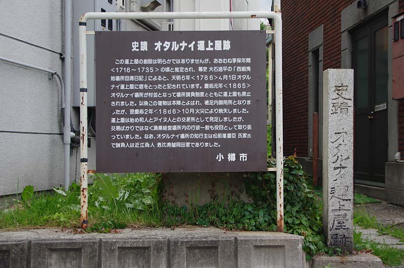 この地域には江差追分「忍路・高島及びもないがせめて歌棄・磯谷まで」にある高島と忍路、オタルナイの3ヶ所に運上屋があった。オタルナイ運上屋の設置時期は明らかではないが享保年間と考えられており、元々はヲタスツにあったらしい。知行主は松前藩重臣の氏家氏、場所請負人は恵比寿屋岡田家でしたが、1865年に場所請負制度の廃止後に本陣となるも、1866年の火災により建物は消失。メルヘン交差点そばに「史跡オタルナイ運上屋跡」の石柱と看板がある。明治以前はニシン場の中心にいたのが運上屋でした。◇記念碑:史跡脊柱と説明板 ◇所在地:小樽市堺町6 ◇G.Maps:43.191045, 141.007079