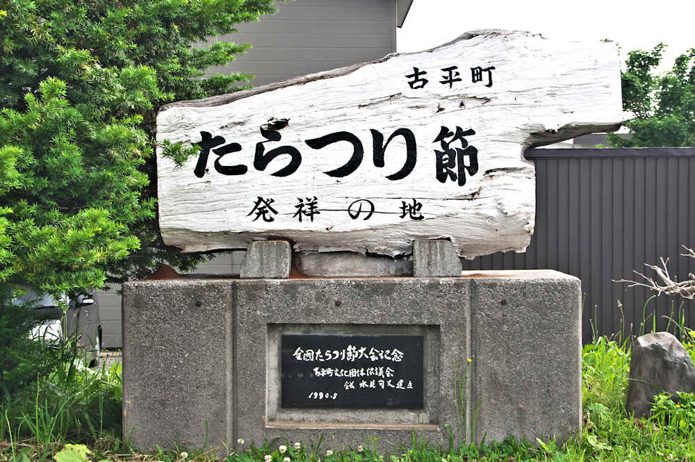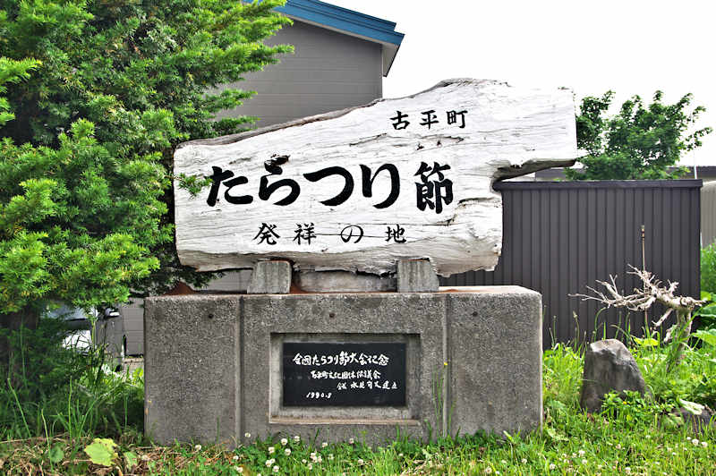 古平町役場と国道229号を挟んで建っている白い石碑。早い時期からニシン漁で栄えた古平町で「たらつり節発祥」はさすがに???でした。1955(昭和30)年頃を境にニシンの漁獲が激減しスケトウダラやイカ漁が行われるようになり、タラ漁に出た漁師達が船上で歌っていたという。この「たらつり節」は1957(昭和32)年頃に古平の漁師、大島豊吉氏と田村栄蔵氏が作ったという。函館東部の南茅部に伝わる「たらつり口説節」が下敷きになっているとのこと。1990(平成2)年以来 毎年秋に「たらつり節全国大会」を開催しているが、碑は第一回全国大会開催を記念して建立されたもの。◇建立年:平成2年 ◇建立者:古平町文化団体協議会 ◊所在地:古平町浜町 ◇G.Maps:43.265717, 140.639202