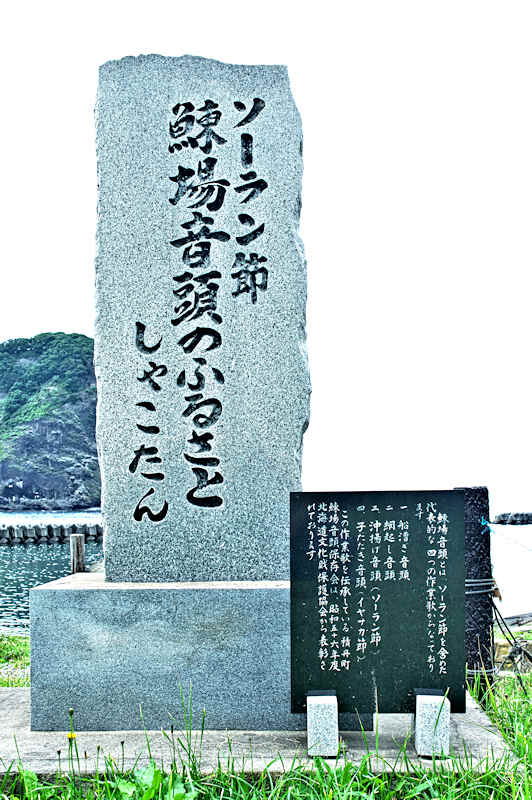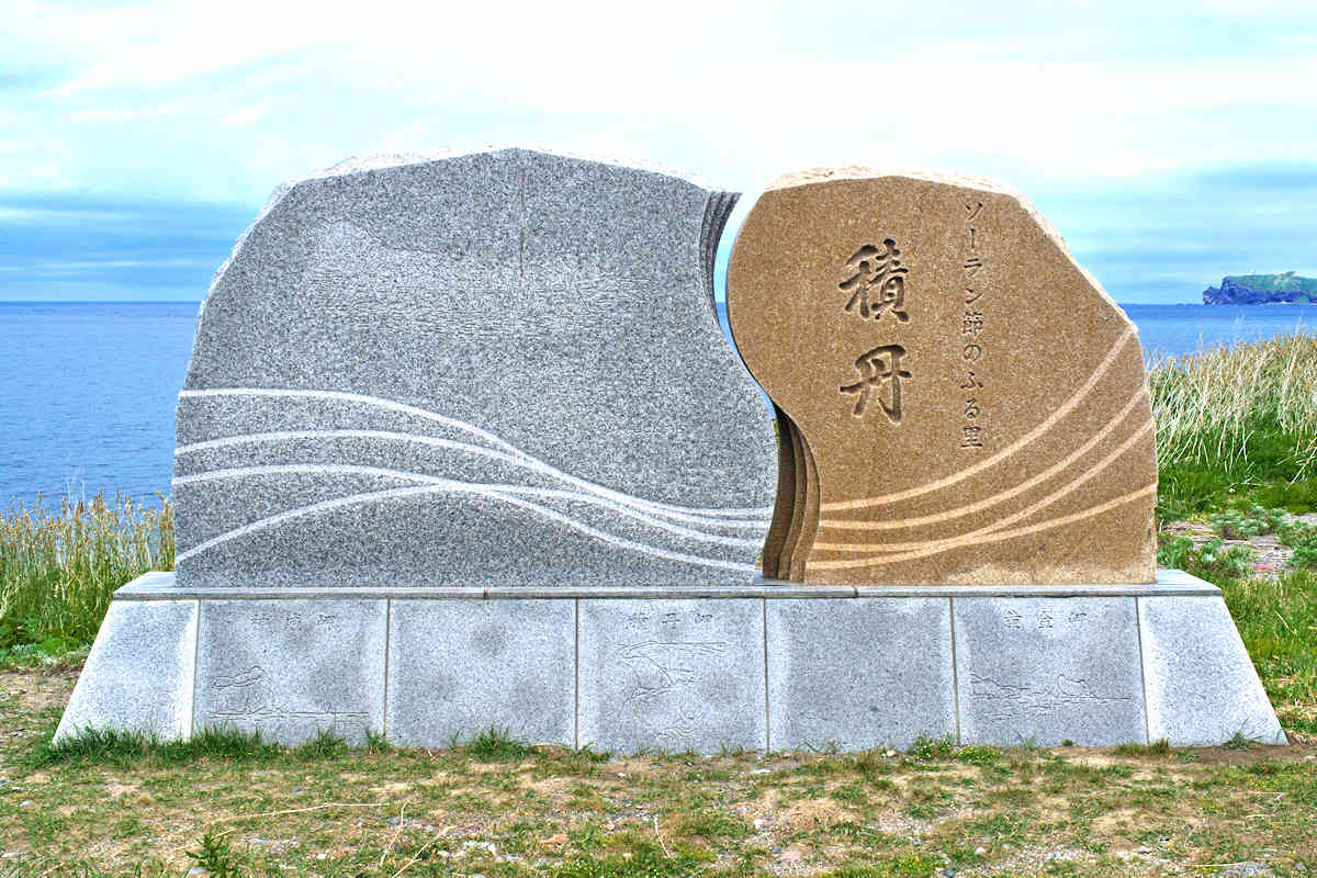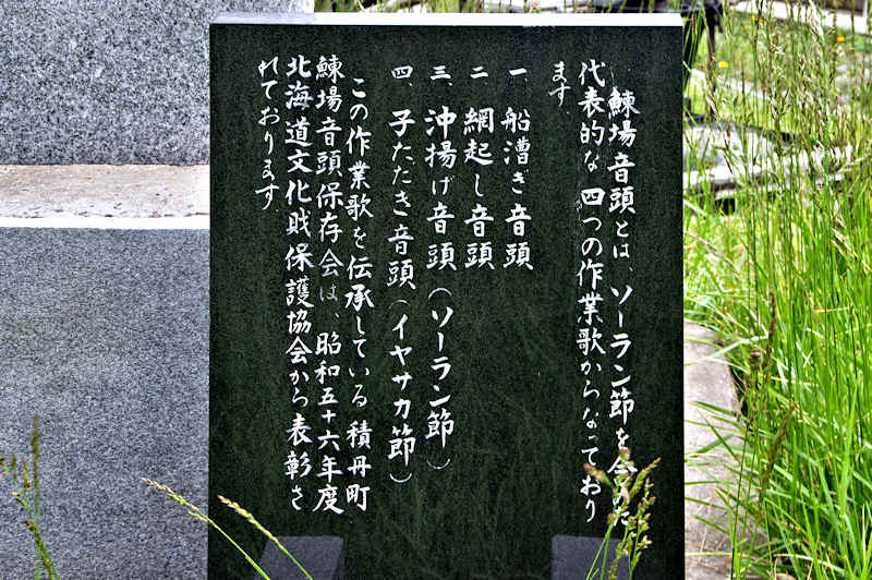 北海道を代表する民謡「ソーラン節」は日本海沿岸部の民謡のふるさとであるとする。碑文より「鰊場音頭とは、ソーラン節を含めた代表的な四つの作業歌からなって降ります。一、船漕音頭 二、網起し音頭 三、沖揚げ音頭(ソーラン節) 四、子たたき音頭(イサカヤ節) この作業歌を伝承している積丹町鰊場保存会は、昭和五十六年度北海道文化財保護協会から表彰されております。」北海道で働く東北地方から鰊場来ている傭漁夫達は、網の中に入った鰊を大きなタモ(網)で救い上げるときに「そーら、そーら」と掛け声をかけるのが「ソーラン節」の元になったとも云われている。明治18(1885)年に斉藤彦三郎氏が鮭魚に使用されていた角網を鰊用に改良した鰊角網を使い成功を収めて積丹有数の漁場経営者となった。このことが契機となって積丹町をソーラン節の発祥の地として石碑を建立したというが、ソーラン節は行成網を使用していたときには既に唄われていたと思われ、大きな網を使用した時からとするのが自然と思う。碑はゴメ島(宝島)を望む海岸縁に建立されているが建立年月と建立者名が刻まれていない。◇設置年:昭和57年 ◇設置者:ソーラン節保存会? ◇所在地:積丹郡積丹町大字美国町字船澗370-1 ◇G.Maps:43.301292, 140.597429