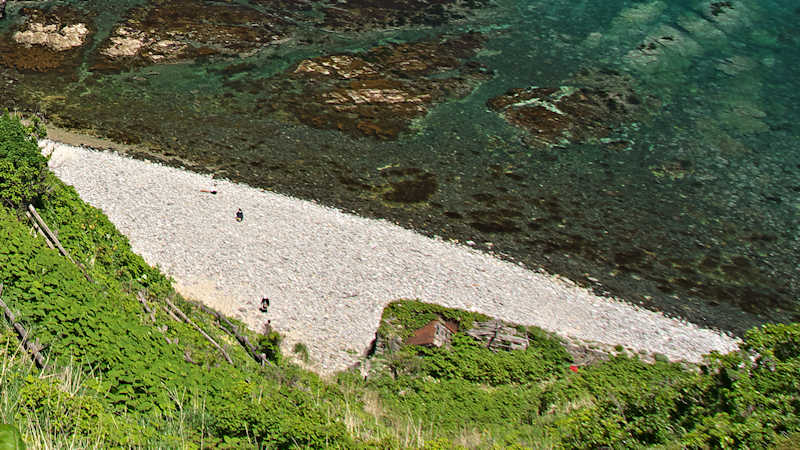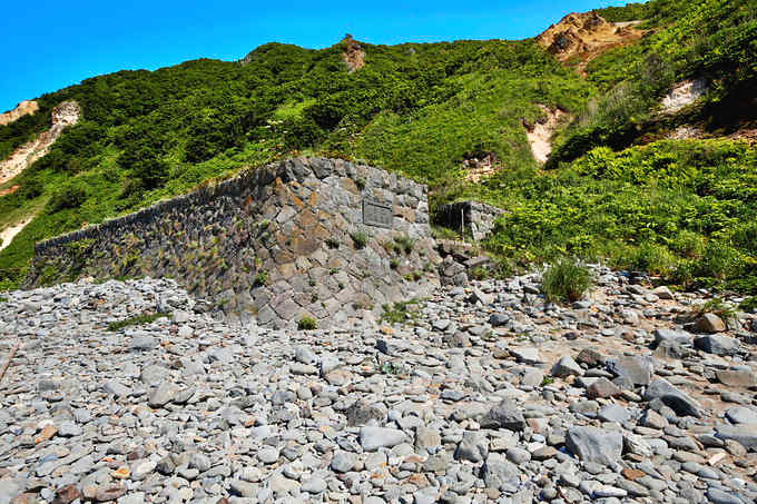 島武意海岸トンネルを抜け九十九折れの急坂を下ると石垣で囲まれた台状の平地があるが、これはヤマカギ(屋号)旧斉藤家のニシン番屋跡地。旧斉藤家の初代、斎藤彦三郎氏(1831~1907)は、鮭魚で使用されていた角網を改良し二代目秋元金四郎とともに定置角網(建網)の開発に成功、嗣子 丈雄は、入舸・余市に計19統を持つ大漁業家となった。その斎藤丈雄の名前が石垣に埋め込まれたプレートに残されている。島武意海岸の素掘りトンネルはニシンを運ぶため明治28年に開削されたトンネルで、ニシンを背負い急坂を登るのは肉体の限界を超える作業だったのかもしれません。島武意の海岸線を航空写真でみると斉藤家の他に番屋が二つあったような痕跡が見える。積丹ブルーの海に隠れた鰊場の遺構です。◇所在地:積丹郡積丹町島武意 ◇G.Maps:43.373086, 140.477544