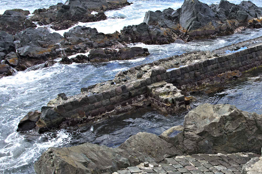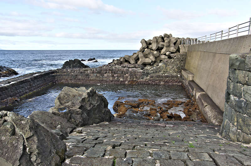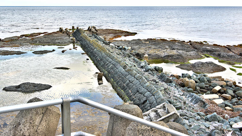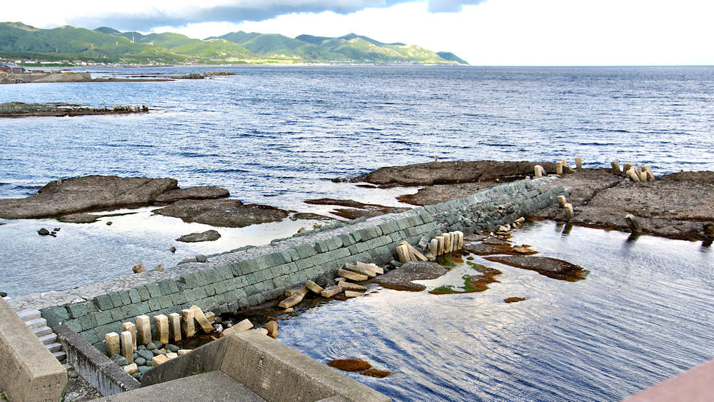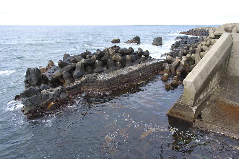 北海道開拓に必須の港湾建設に取り残された松前では、松前商人の栖原が私財を投じ明治6年に北前船が発着した海岸に波止場の建設と護岸の修復などを行い、本格的な波止場建設の要望を訴えますが実現にいたらず、栖原は町の有力者達に呼びかけ波止場建設費の寄付金を集め、不足分を政府から20年賦で借り入れ明治8年に建設、松前城を解体した際の石材を利用した70mと90mの堤でした。明治22年に小破補修、明治25年から3年をかけて本格的な補修工事がされている。石積突堤の先端付近にある花崗岩の石柱は北前船のバラスト材として持ち込まれたものを転用したものだという。北海道で最も初期の練積みコンクリートで築造された堤体は、明治初期の明治32年頃より始まった石積堤を持つ袋澗築設にも活かされているようです。平成26年度に土木学会選奨土木遺産の遺産に選ばれている。◇所在地:松前郡松前町唐津 ◇G.Maps:41.426210, 140.108196