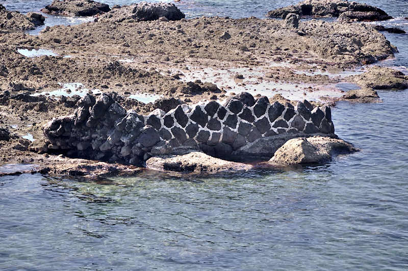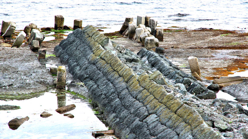 汐首岬灯台直下付近にあり間知石布積み5~6段の石垣が陸と並行し先端部は細まってり自然の露岩に至って終わる。逆堤端は45°程の浅い角度でまがり陸に接し消波ブロックに覆われている。天端は一部残存し巻き天端で石造係留柱があり裏込には鉄筋が挿入されていた。港口は見た目とは違い実質は南西向きに開口していると思われ、現役の船揚場とした利用されているためか水深もある。珍しいのは鉄筋が使用されていること、鉄筋を見たのはここと利尻島の平田の袋澗だけでした。陸側を見ると旧戸井線コンクリートアーチ橋が見えます。◇澗利用:船揚場 ◇所在地:函館市汐首町 ◇G.Maps:41.710194, 140.968556