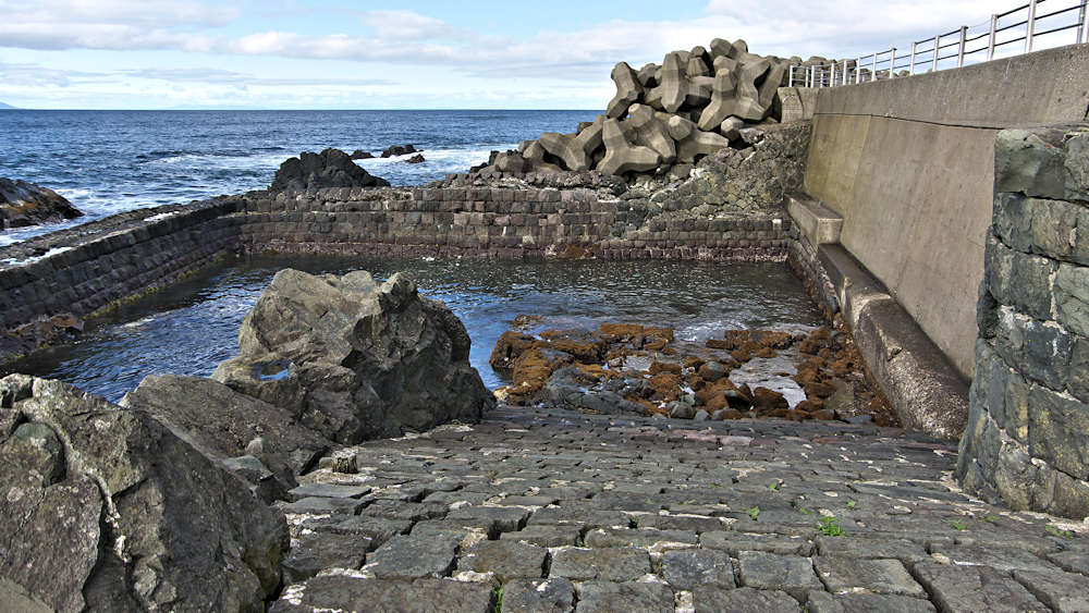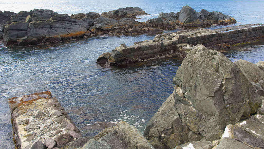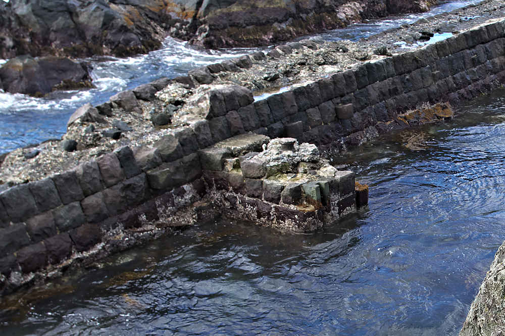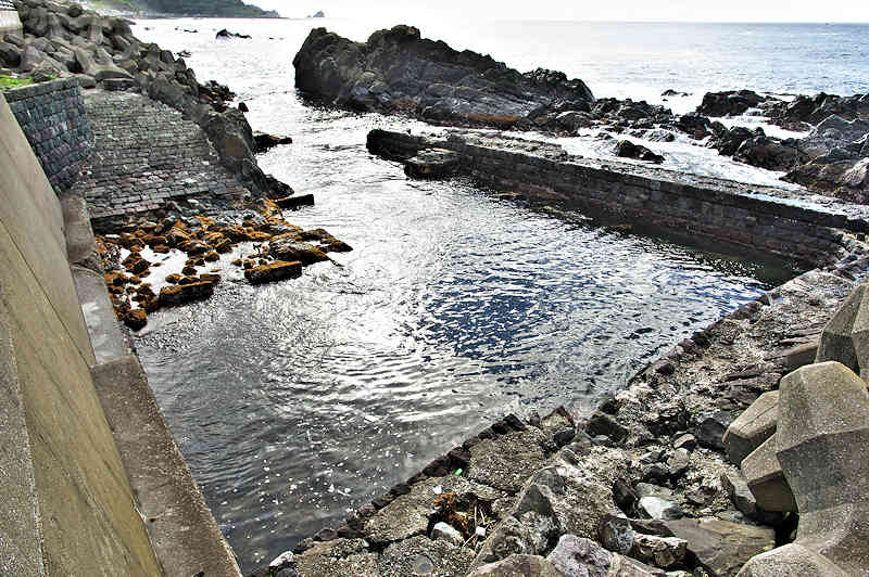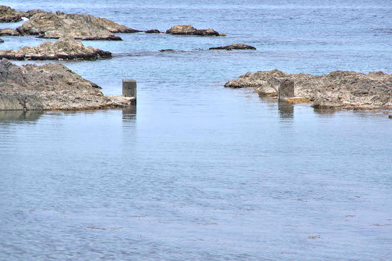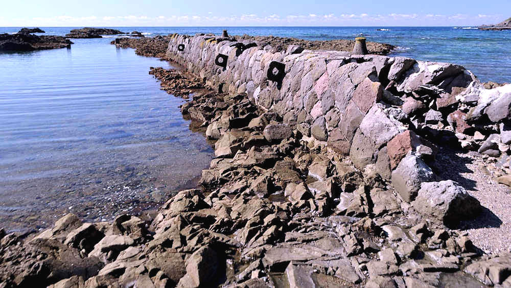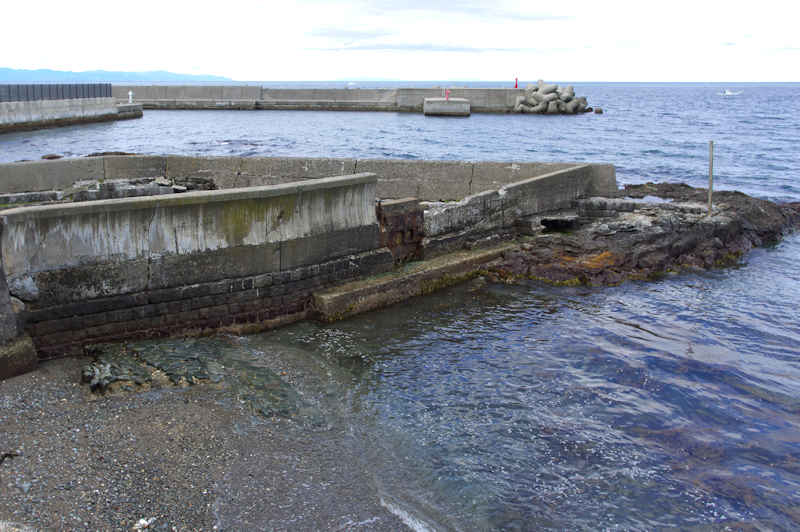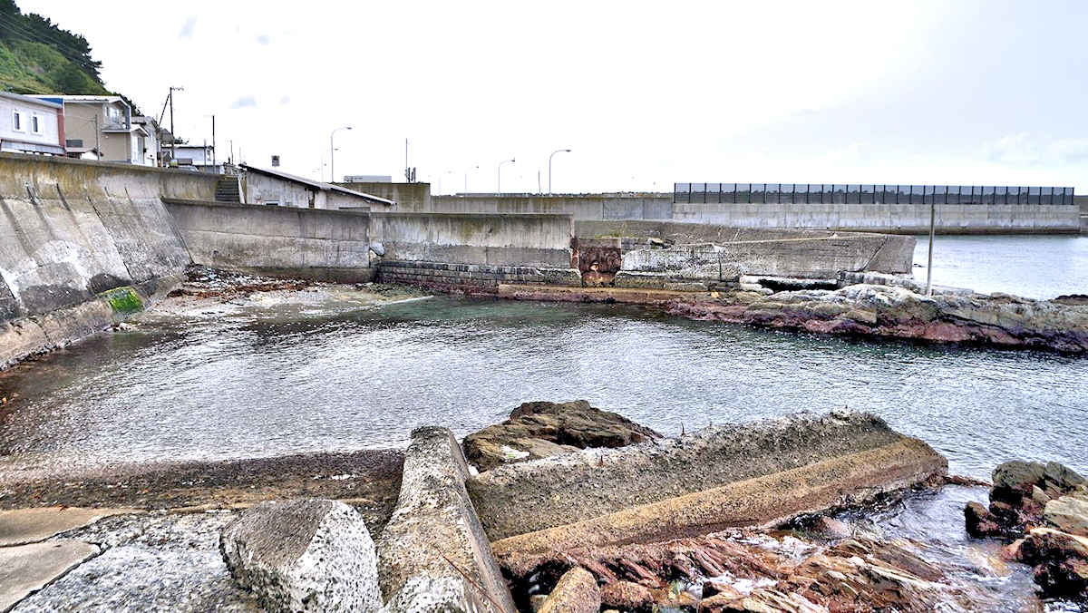 汐首漁港の北西に位置しアワビ中間育成場として整備され港内の隅に隔離されたようにあるが今は利用されていない。堤体は間知石布積み水面上4~5段で上をコンクリートで補強、間知石が見られない北側の堤の開口部をコンクリートで塞いだようで開口部が見当たらず澗内の透明度は低い。孤を描いて南から東西に伸びる堤は横断面が階段状の箇所があり天端に石造係留柱があります。陸には間知石布積みの護岸が残っています。◇澗利用:無利用 ◇所在地:函館市汐首町 汐首岬灯台直下 ◇G.Maps:41.710389, 140.964222