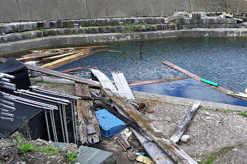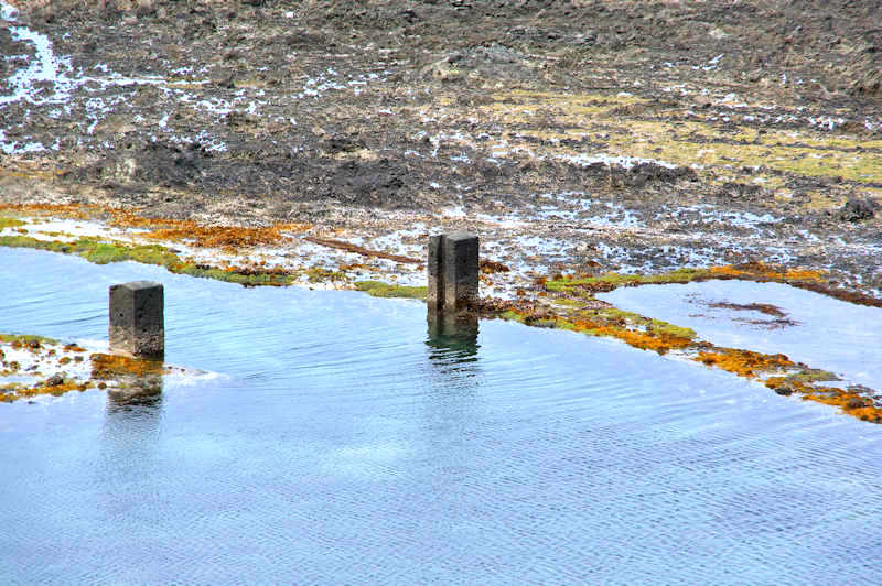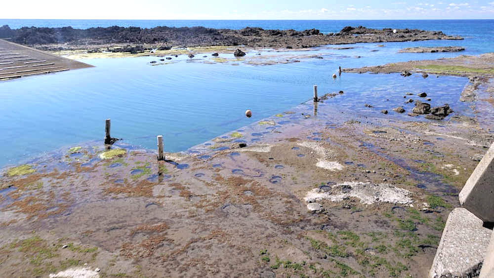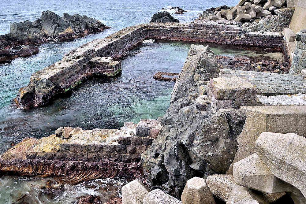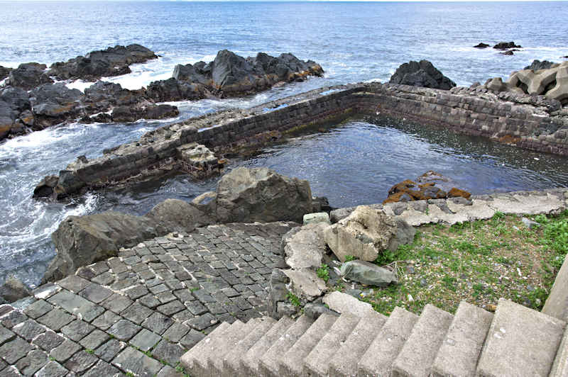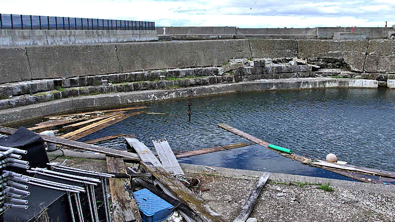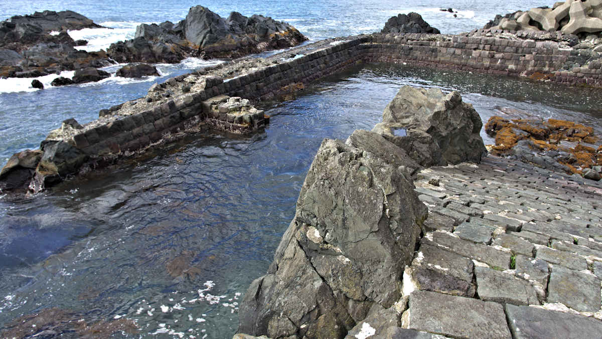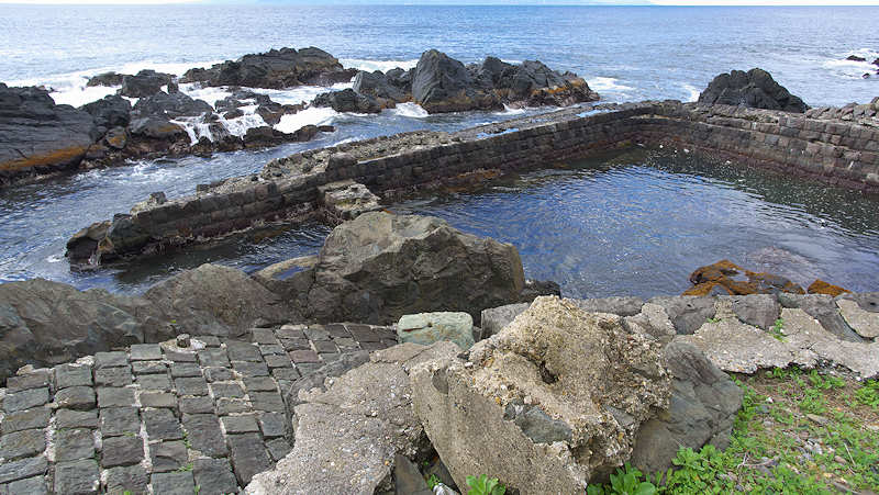 汐首漁港の北西に位置しアワビ中間育成場として整備され港内の隅に隔離されたようにあるが今は利用されていない。堤体は間知石布積み水面上4~5段で上をコンクリートで補強、間知石が見られない北側の堤の開口部をコンクリートで塞いだようで開口部が見当たらず澗内の透明度は低い。孤を描いて南から東西に伸びる堤は横断面が階段状の箇所があり天端に石造係留柱があります。陸には間知石布積みの護岸が残っています。◇澗利用:無利用 ◇所在地:函館市汐首町 汐首岬灯台直下 ◇G.Maps:41.710389, 140.964222
