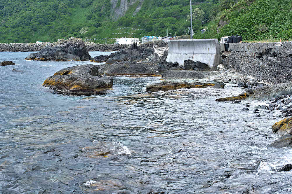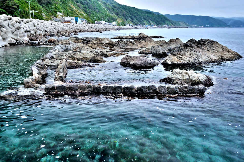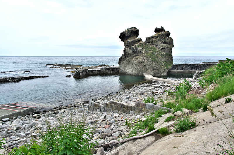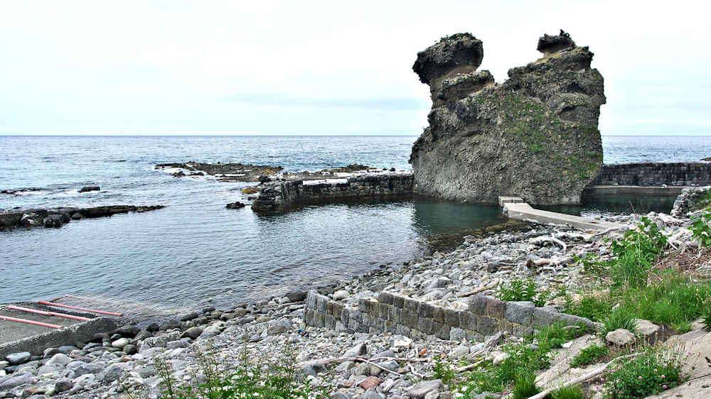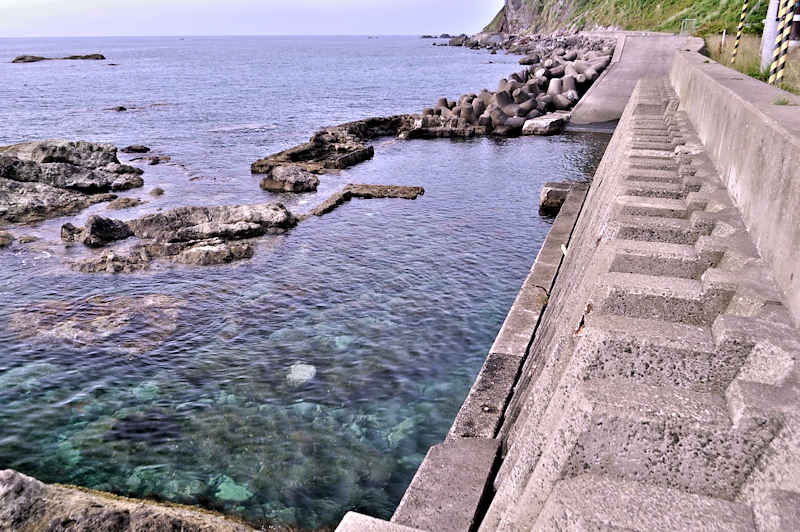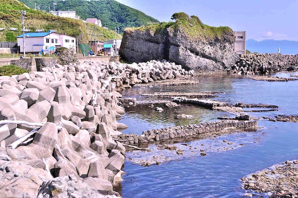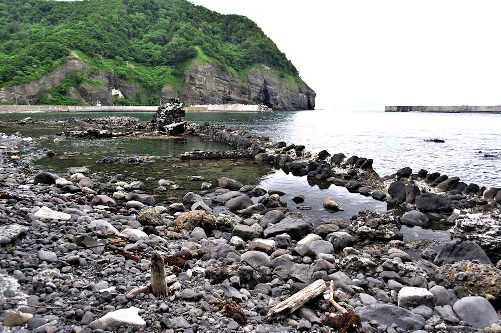 竜神岬の近くの小トンネル近く外にある袋澗跡。防波堤の一部が2箇所現存し片方は間知石、もう片方は布石が使われている。道の行き止まりから海岸を徒歩で行くか、釣り人が平盤使に出る時に利用する竜神岬に行く踏み分け道で。途中から海岸に降る(海岸に下る踏み分け道がある)かになります。◇築年月:明治末□頃 ◇堤構造:間知石練積 ◇澗利用:無利用 ◇所在地:神恵内村大字神恵内村 ◇G.Maps:43.138468, 140.428925