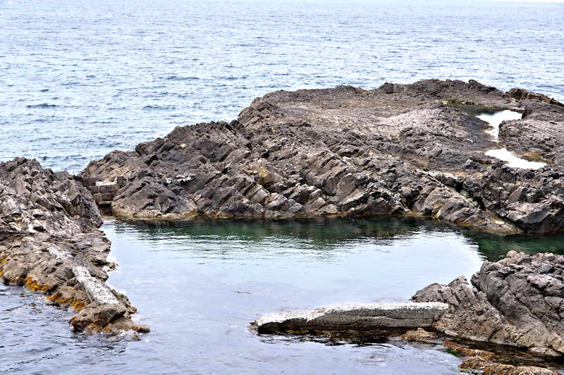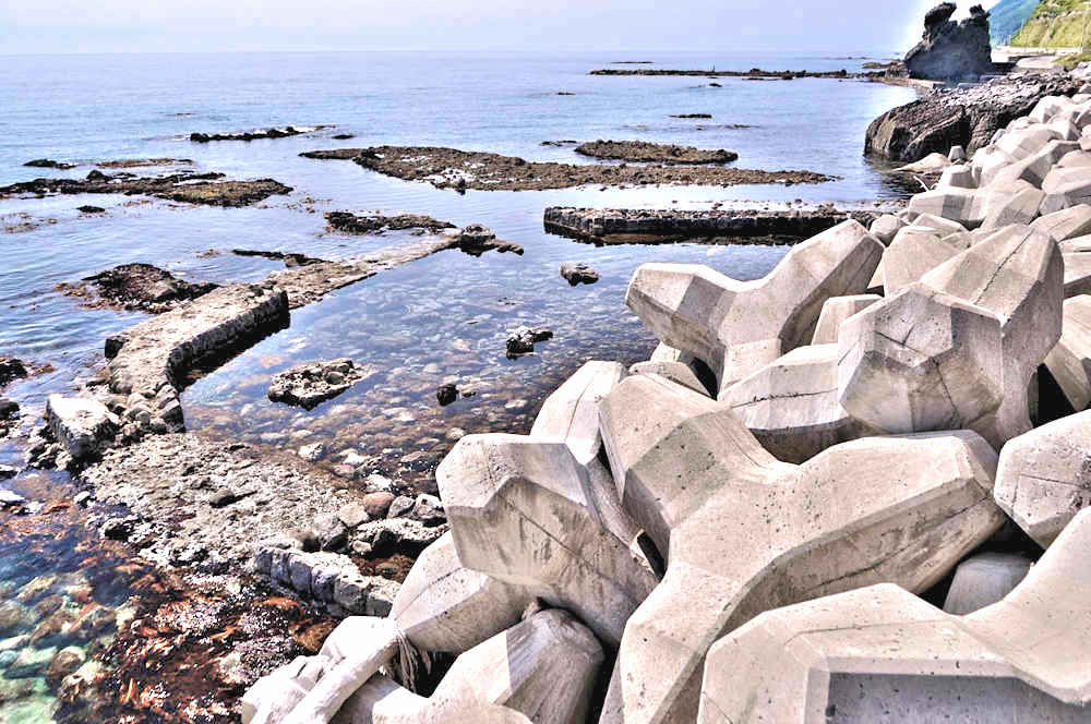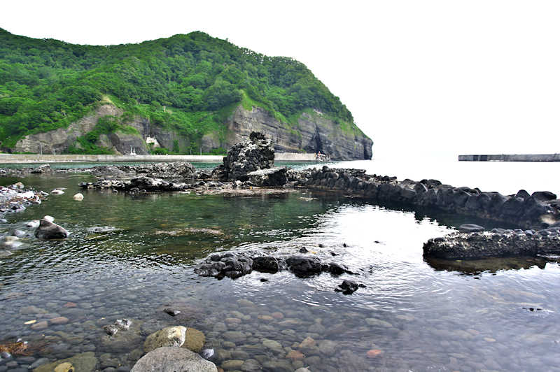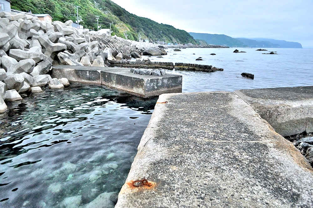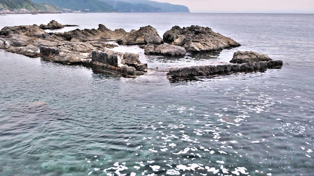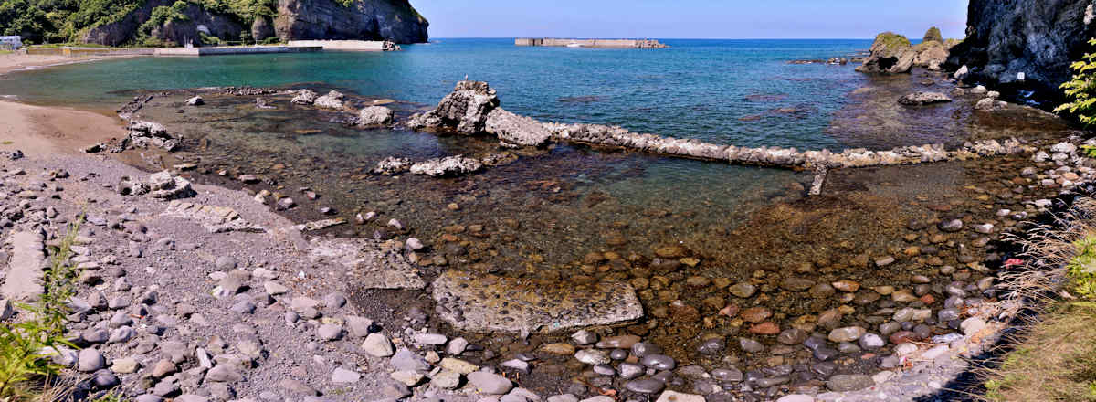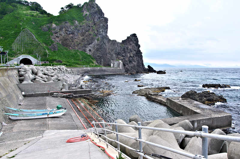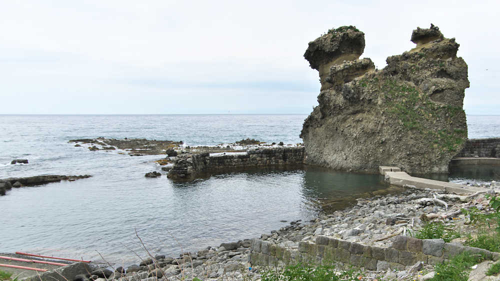 竜神岬の近くの小トンネル近く外にある袋澗跡。防波堤の一部が2箇所現存し片方は間知石、もう片方は布石が使われている。道の行き止まりから海岸を徒歩で行くか、釣り人が平盤使に出る時に利用する竜神岬に行く踏み分け道で。途中から海岸に降る(海岸に下る踏み分け道がある)かになります。◇築年月:明治末□頃 ◇堤構造:間知石練積 ◇澗利用:無利用 ◇所在地:神恵内村大字神恵内村 ◇G.Maps:43.138468, 140.428925