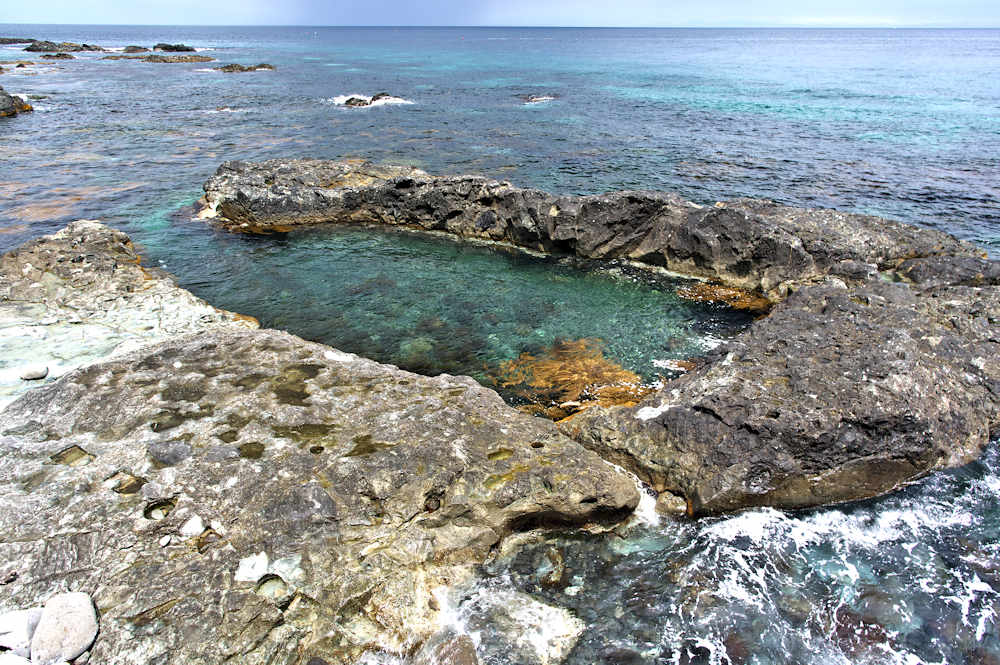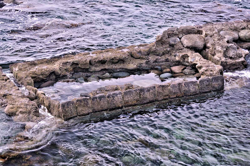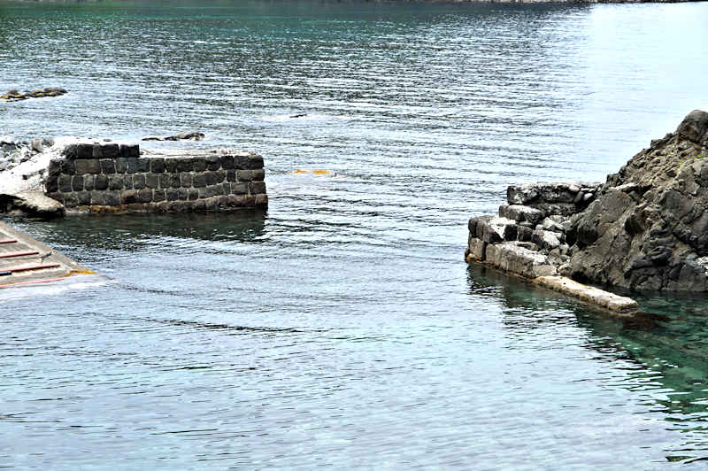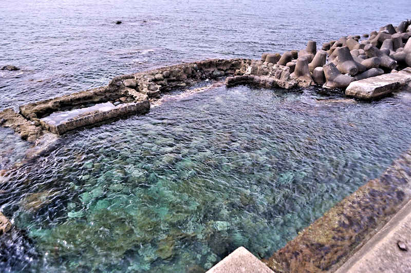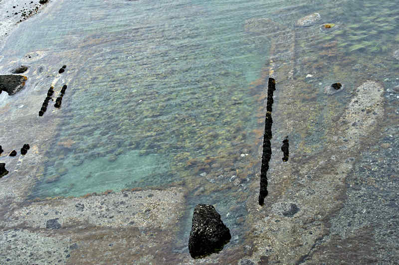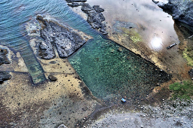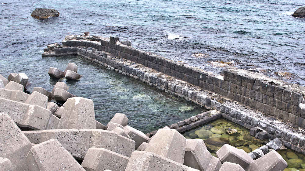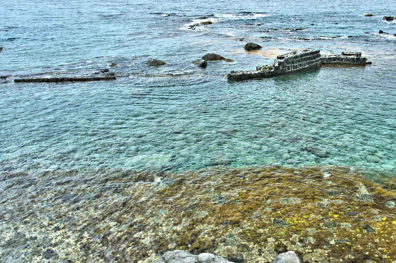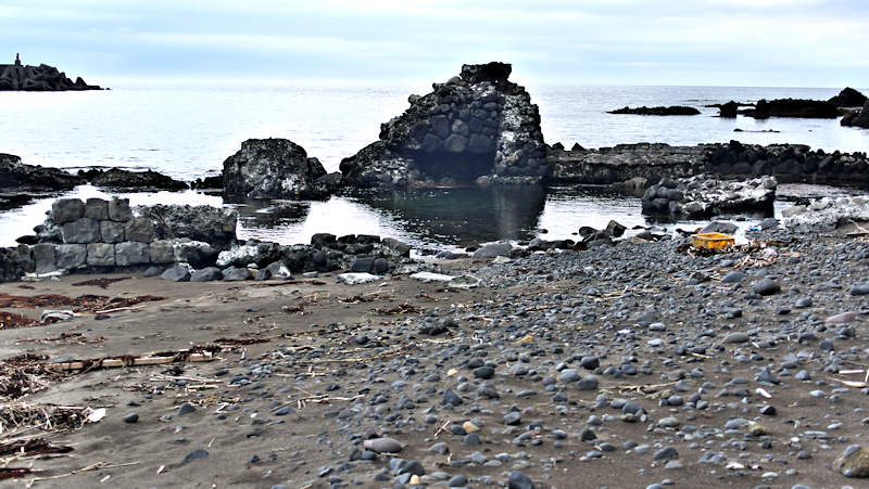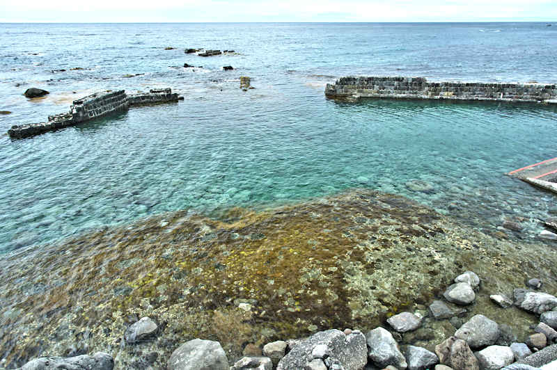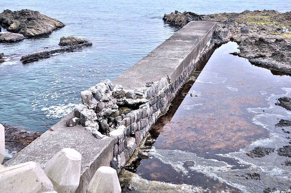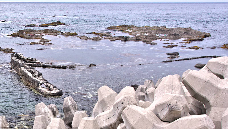 参考にした『積丹半島の袋㵎』では大きな石垣が見られたが、今は水面上に僅かに見える程度しか残っていません。堤は布積みと谷積みが複合し一部間知石3段相当の高さが残るも、澗の半分近くが波消ブロックに埋没し埋没を免れた所も礫や石で埋まり浅くなっている。海岸に降りられるようになっているので、見学には好都合だが遺構がそれに見合っていない。◇築年月:大正元年前 ◇所有者:北海道拓殖銀行 ◇堤構造:間知石練積 ◇澗利用:無利用 ◇所在地:神恵内村大字赤石村大森 ◇G.Maps:43.163107, 140.388229