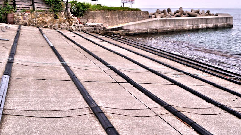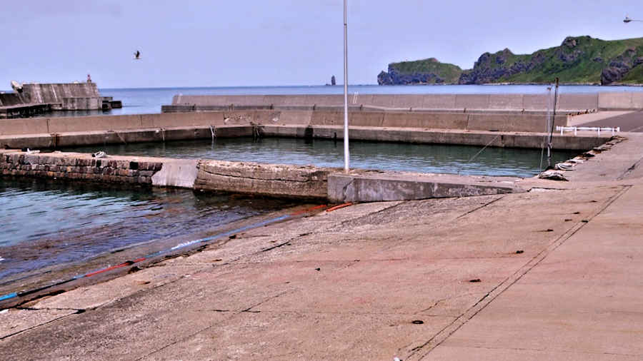 ニシンの大群で押し寄せるのは「群来=ぐんらい」、そのニシンが産卵し海面一帯が牛乳を流したような乳白色になるのを「群来=くき」というそうで、それが地名に残った群来(くき)町に残る袋澗跡、残っているのは残念ながら袋澗に接した陸側の長い石垣の護岸と船揚場の一部にある石垣、船揚場として使用されているため切澗の深さは保っているが、堤はコンクリート化されている。◇築年月:大正12年 ◇堤構造:間知練積 ◇澗利用:船揚場 ◇所在地:古平町大字群来町 ◇G.Maps:43.291613, 140.632349