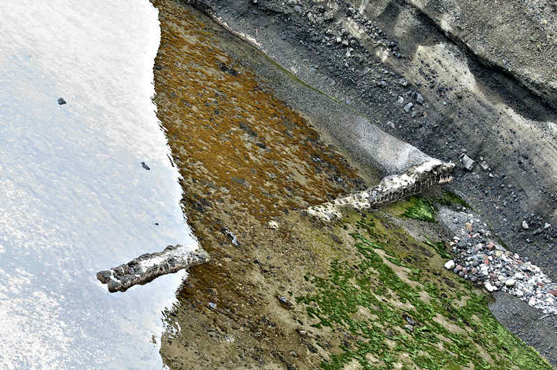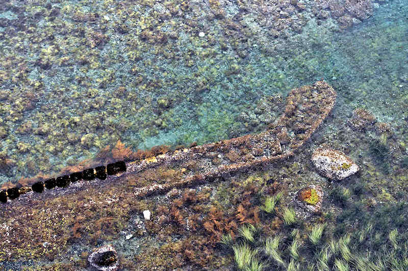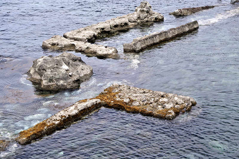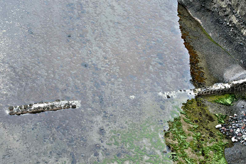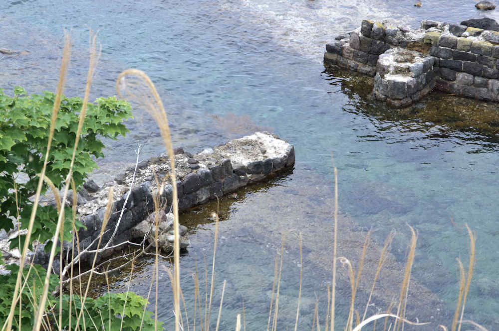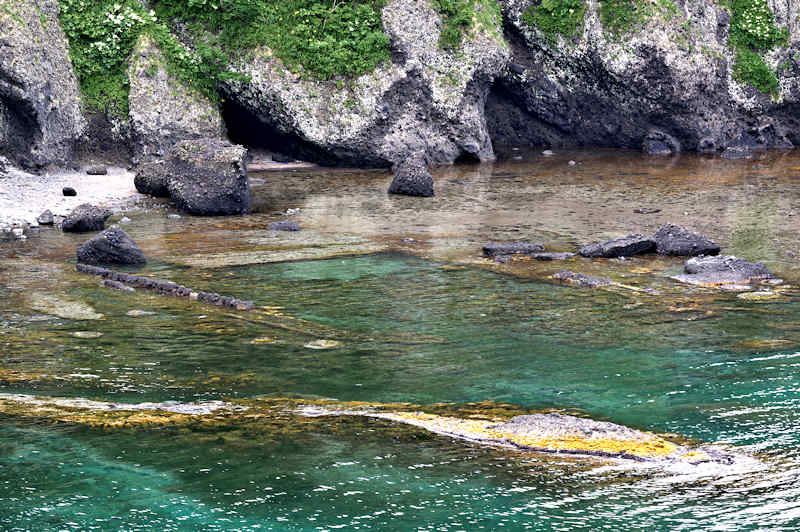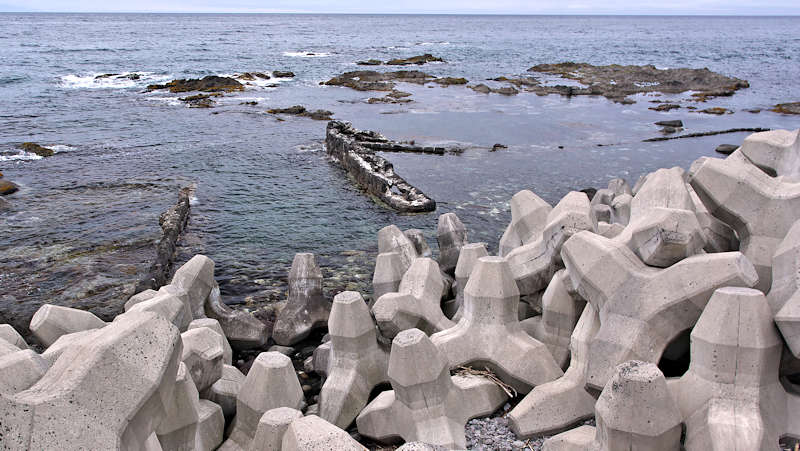 『積丹半島袋澗現況調査』の時は現役の船着場というだけあって世界遺産クラスとも云われ、産業考古学会推薦産業遺産に選定された頃に撮影された写真が北海道文化遺産データベースにあるが、セメントの寿命(当時のセメントは80年とか)を越え、どの袋澗も急速に崩壊が進んでいるという。S54号袋澗は竜神岬下の小湾にあるハサミ系の構造で縦横20mの堤体と切澗共によく残っているが、沖側に出ていた堤は殆ど形を失い縦横の堤はともに石積堤の最上段は崩壊し部分的には其の下の段と天端を欠いた状態で悲惨な状況。それでも積丹半島に残された袋澗遺構では旧状を良く維持しているほうです。国道からは見られず歩かなければならないが岬の神社に行く踏み跡程度の道しかないので行くならば草の伸びる前が良い。◇築年月:大正6,7年に改築 ◇堤構造:間知石練積 ◇澗利用:無利用 ◇所在地:神恵内村大字神恵内村 ◇G.Maps:43.136312, 140.427724