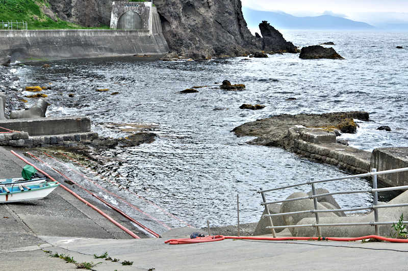 国道の整備で澗の広さは半分以下になった印象だが、波消ブロックが入っていないのは比較的遅くまで船揚場として使われていたのか、澗の水深があり船揚場としていつでも使えそうな雰囲気がある。石垣の崩壊は進行中で水面に僅かに顔を出す程度の高さになっている。◇築年月:大正初期? ◇経営者:浜中又吉 ◇堤構造:間知石練積及場所詰 ◇澗利用:無利用 ◇所在地:神恵内村大字珊内村川白 ◇G.Maps:43.223895, 140.326249