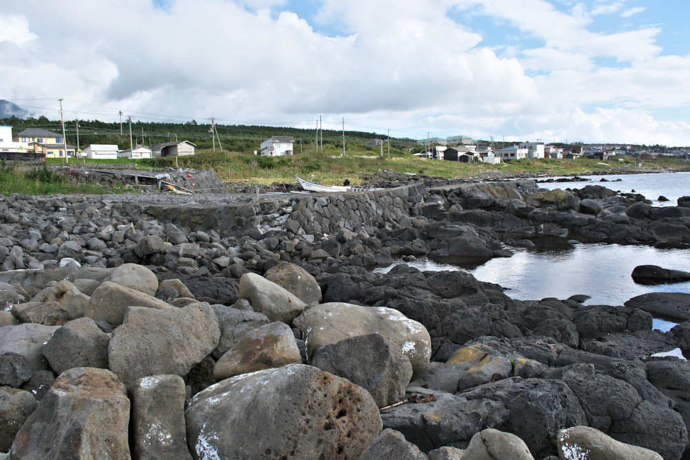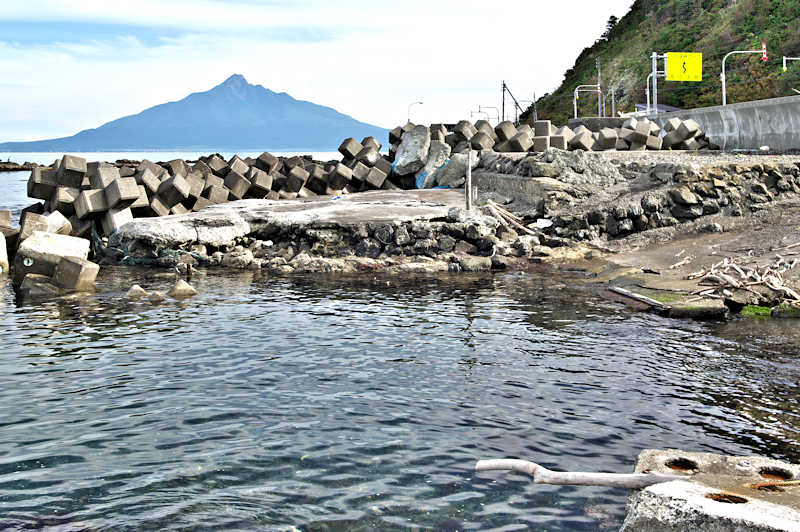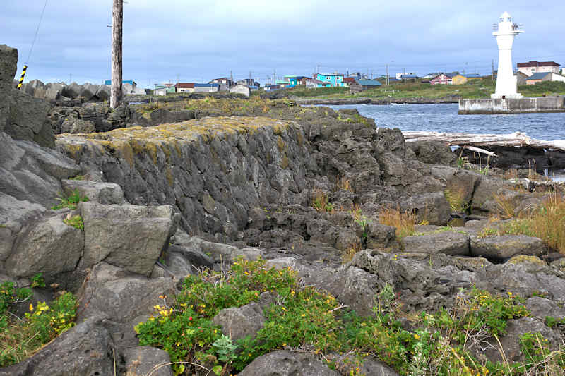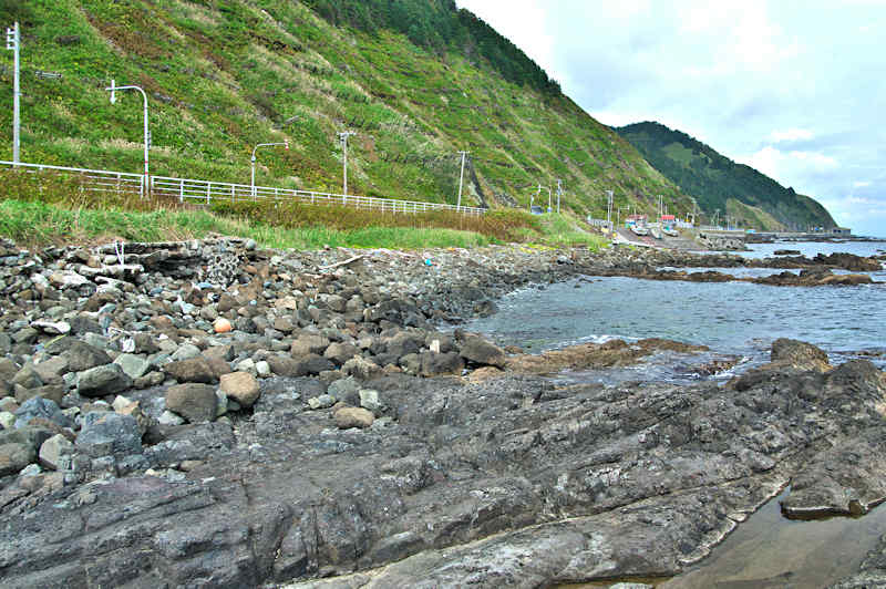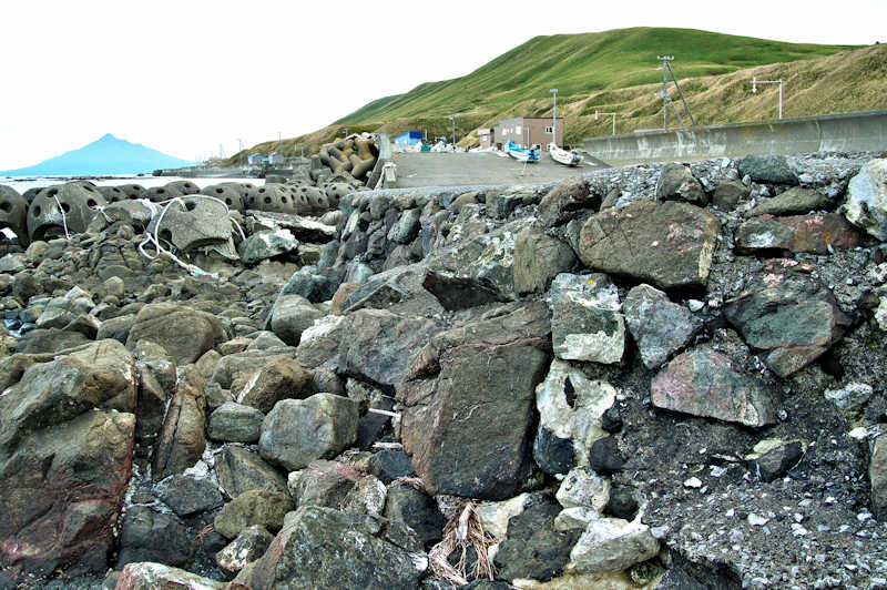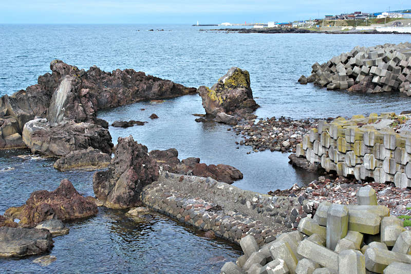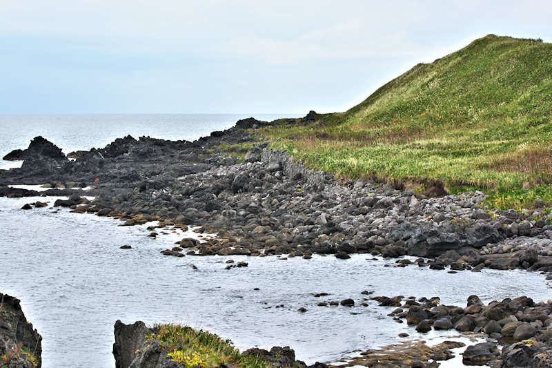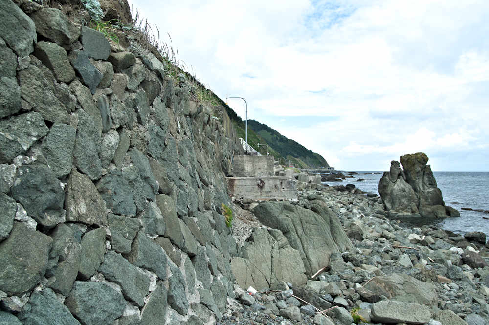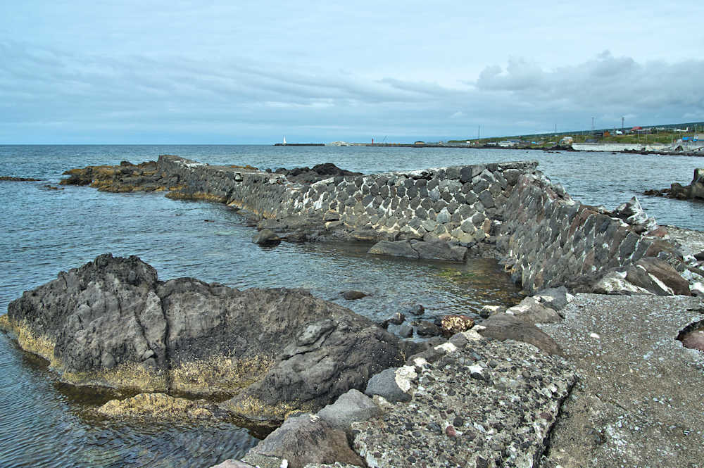 御崎海岸はミニリアス式海岸といった雰囲気で利尻でも特殊な地形の海岸、約1.5Kmの海岸に澗が30ヶ所程ある澗の密集帯で袋間も含まれるが痕跡が僅かに残っている程度で原型を留めている袋間はない。御崎漁港はホッケ澗?だったと云い、御崎漁港の横に石積堤が残っている。ホッケの澗の両隣の澗を含めて袋澗を形成していたようですが、今の遺構から袋澗全体の形は想像できない。◇築年月:不詳 ◇堤構造:間知石練積? ◇澗利用:御崎漁港 ◇所在地:利尻町仙法志御崎 ◇G.Maps:45.102830, 141.227733