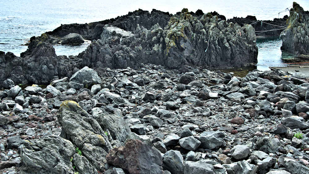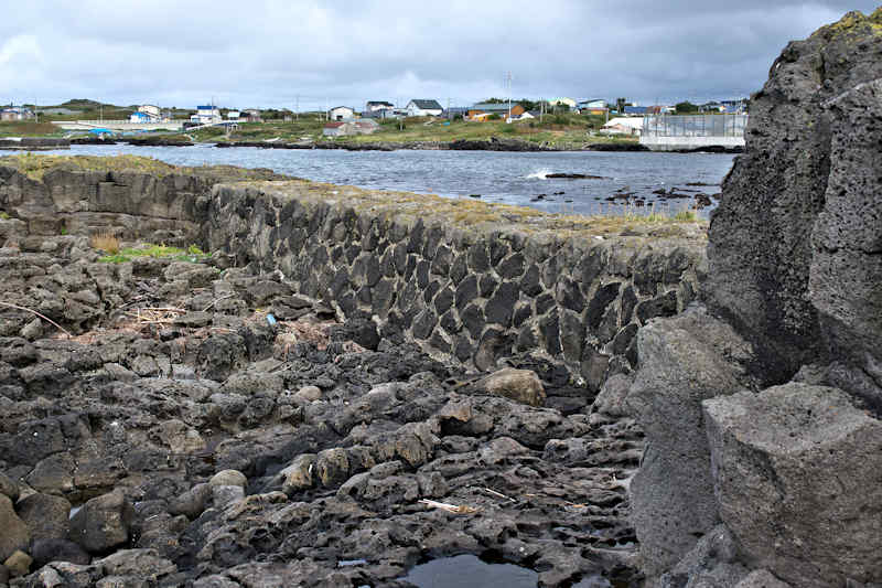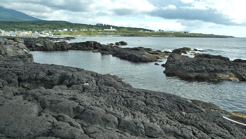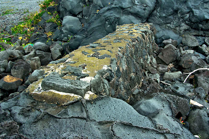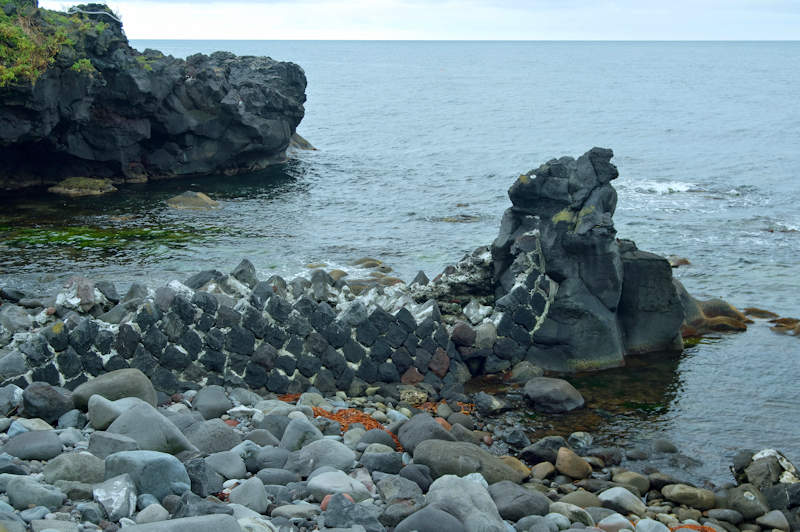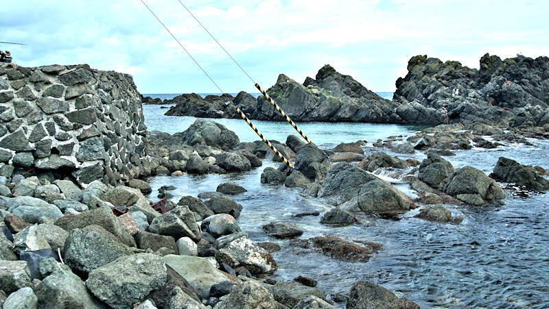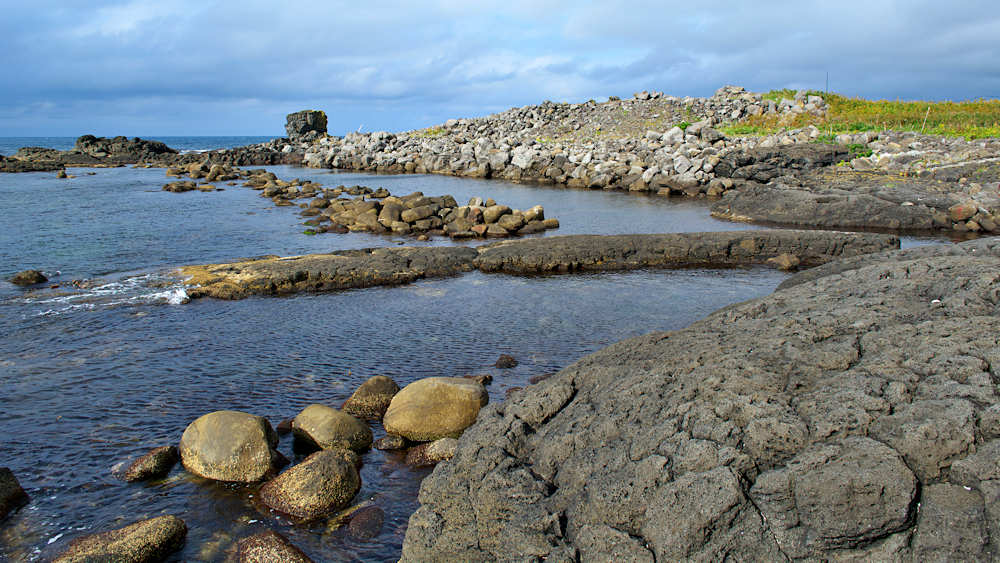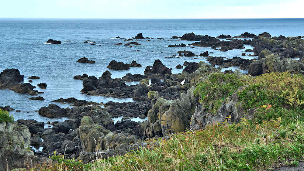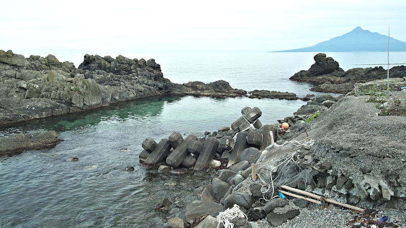 御崎海岸はミニリアス式海岸といった雰囲気で利尻でも特殊な地形の海岸、約1.5Kmの海岸に澗が30ヶ所程ある澗の密集帯で袋間も含まれるが痕跡が僅かに残っている程度で原型を留めている袋間はない。御崎漁港はホッケ澗?だったと云い、御崎漁港の横に石積堤が残っている。ホッケの澗の両隣の澗を含めて袋澗を形成していたようですが、今の遺構から袋澗全体の形は想像できない。◇築年月:不詳 ◇堤構造:間知石練積? ◇澗利用:御崎漁港 ◇所在地:利尻町仙法志御崎 ◇G.Maps:45.102830, 141.227733