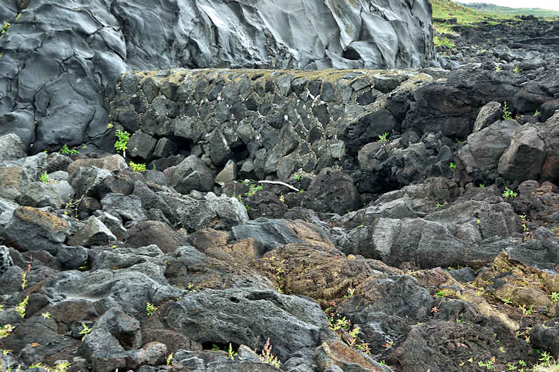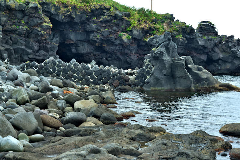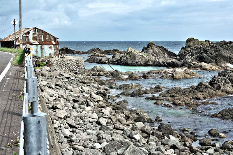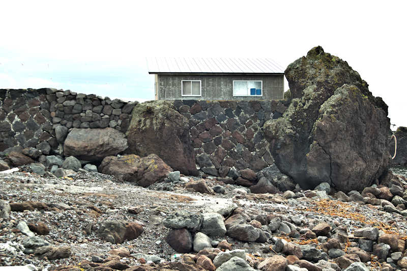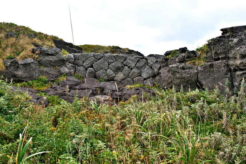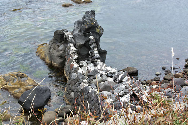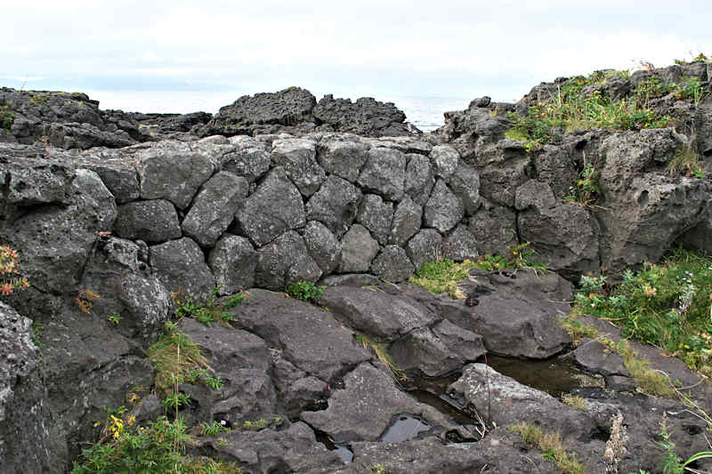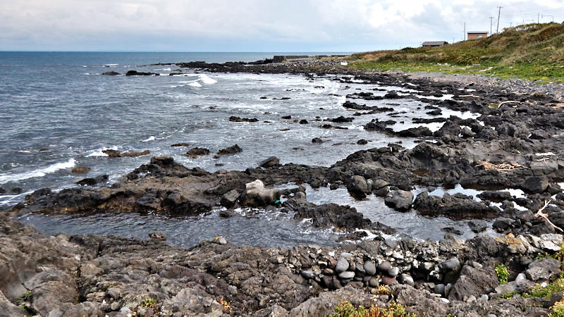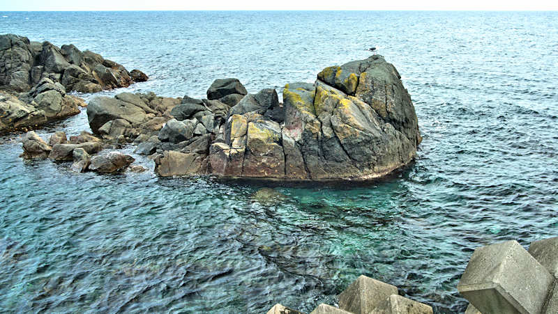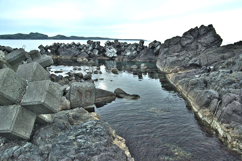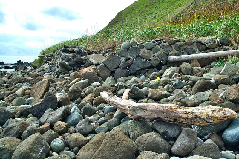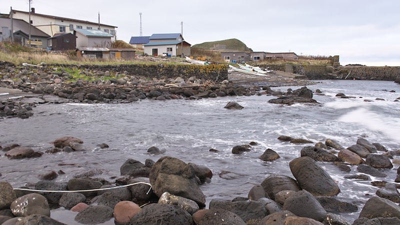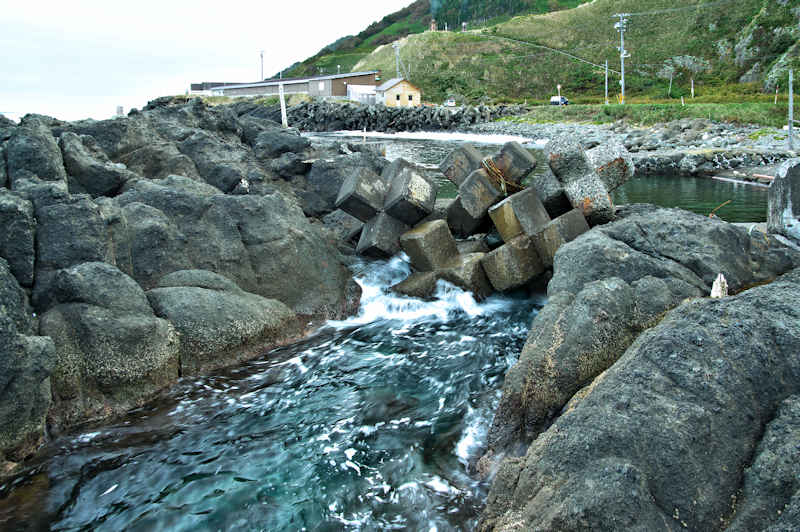 Googlemapの航空写真を見て大磯漁港から東側の富士岬にかけて巡ってみた。袋澗が存在しても良さそうな海岸地形だが明瞭な袋澗跡はなく、本泊漁港近くの岩場の上に2ヶ所の石積堤と切澗を見たのみ。岩場を切って防波堤代わりにし、高さのない部分を石積堤で補完したものと思われ、主に間知石を使った3から5段の谷積と思われる堤体、天端部は平坦、切澗は浅くなっており船揚場も使用されている様子はない。単独の澗としては小さいが複数の澗ならば袋澗としても十分だったとおもわれるが、湾内の核心部は漁港に変わっているが、古くは運上屋の前浜で港でもあった。◇築年月:不詳 ◇堤構造:間知石谷積 ◇澗利用:無利用 ◇所在地:利尻富士町鴛泊本泊 ◇G.Maps:45.253009, 141.184879
