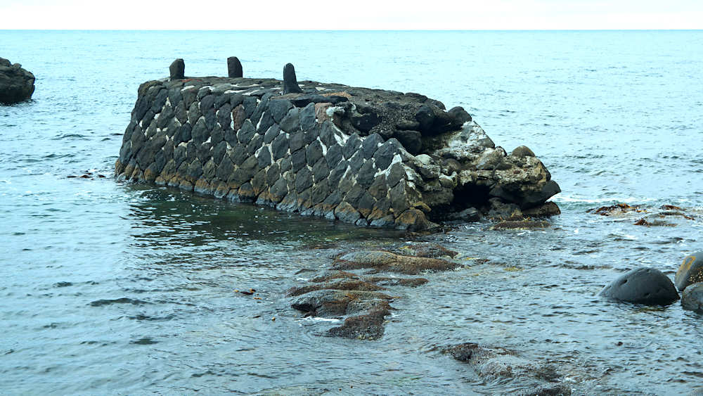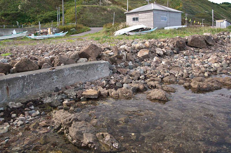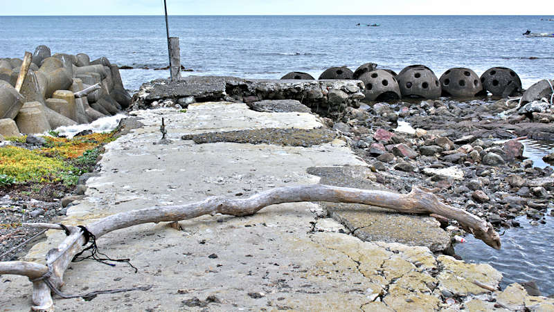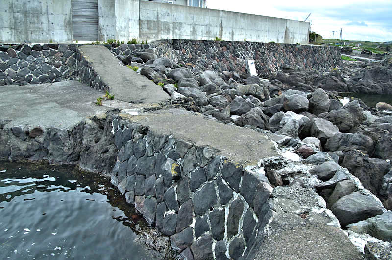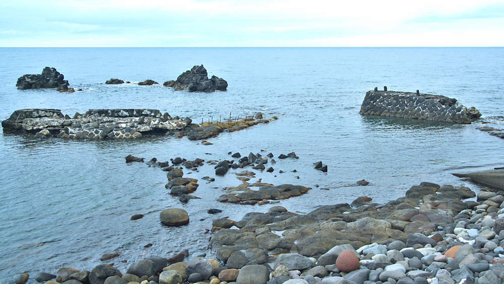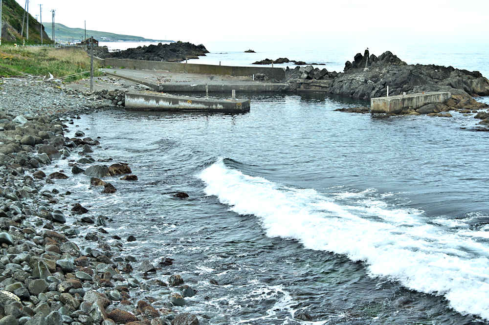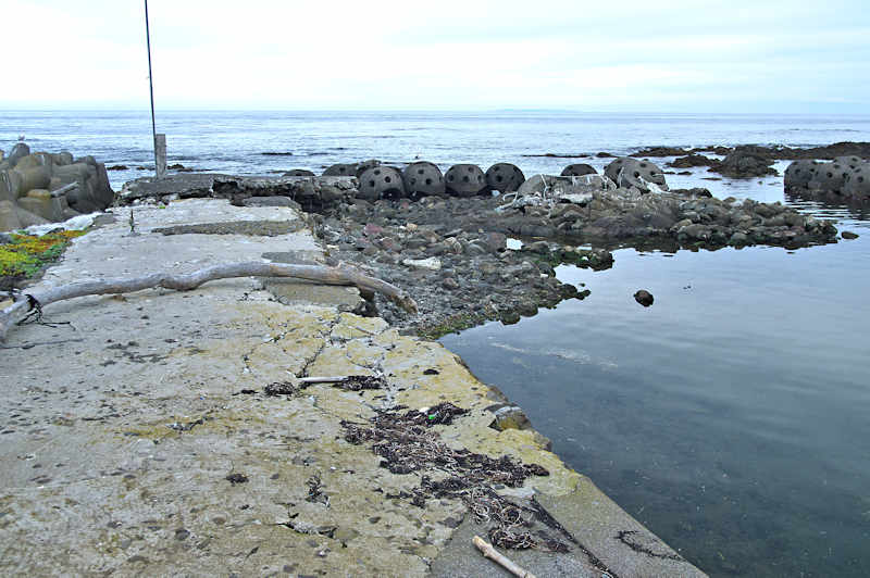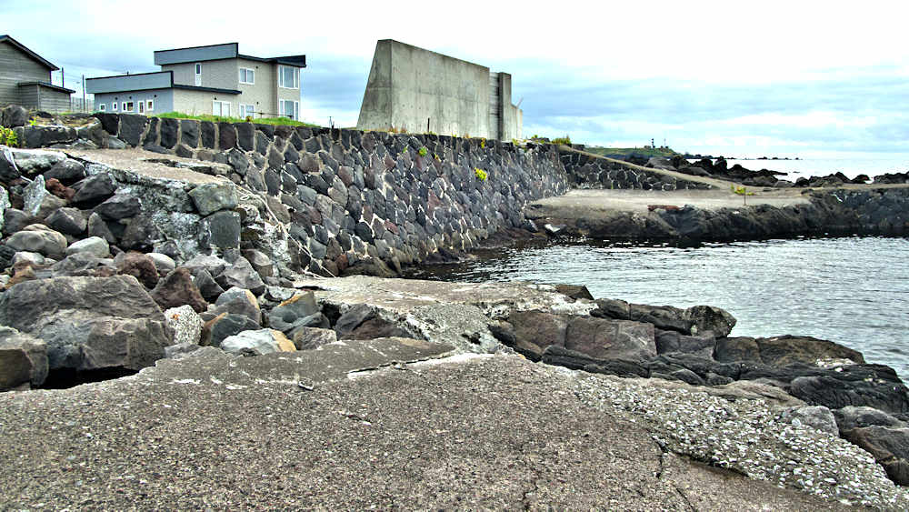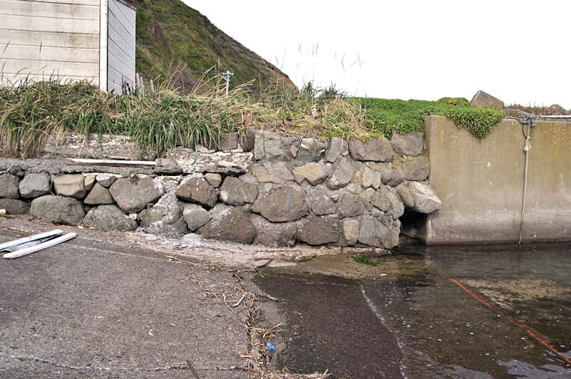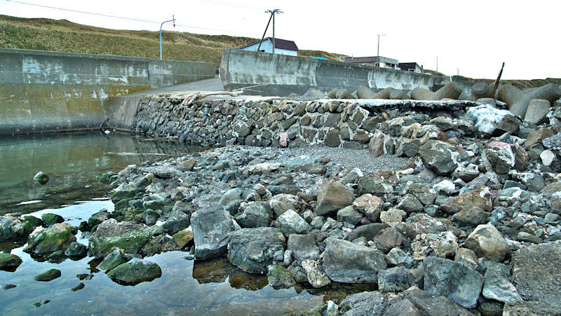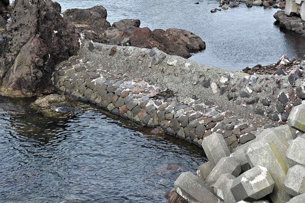 仙法志漁港東防波堤基部でバス停「ほのぼの荘前」にある船揚場に石積堤の一部が残っている。堤体の形から澗の全体像を窺うことは出来ないが西側には浪けしブロックがありハサミ型の袋澗跡であった可能性が濃厚な印象だった。岩場を利用した堤体の上部は殆ど崩壊、残った一部に布積みのように見える部分もある。◇築年月:不詳 ◇堤構造:見知石布積み? ◇澗利用:船揚場 ◇所在地:利尻町仙法志政泊 ◇G.Maps:45.111846, 141.211679