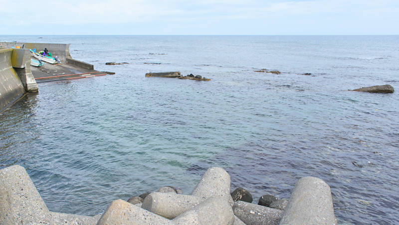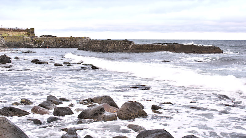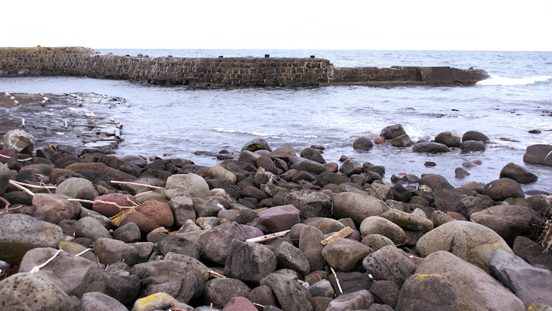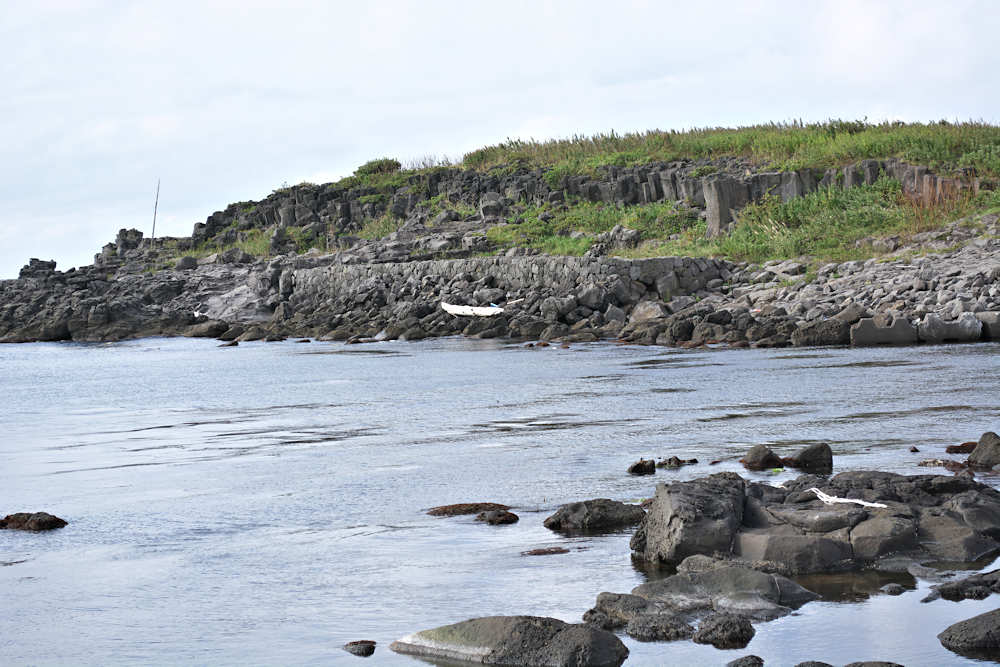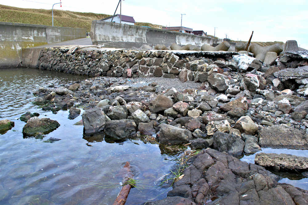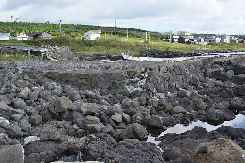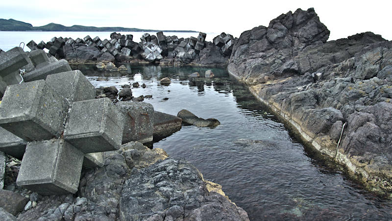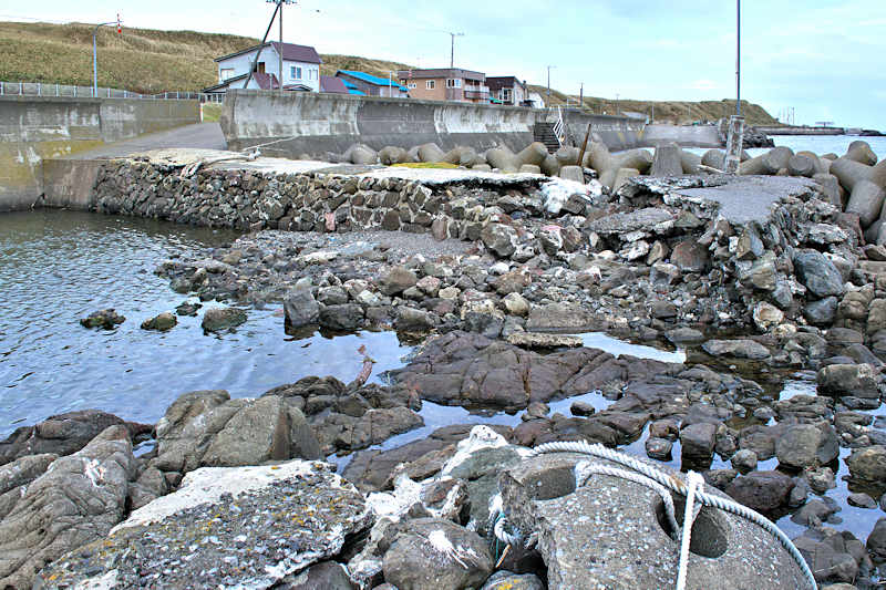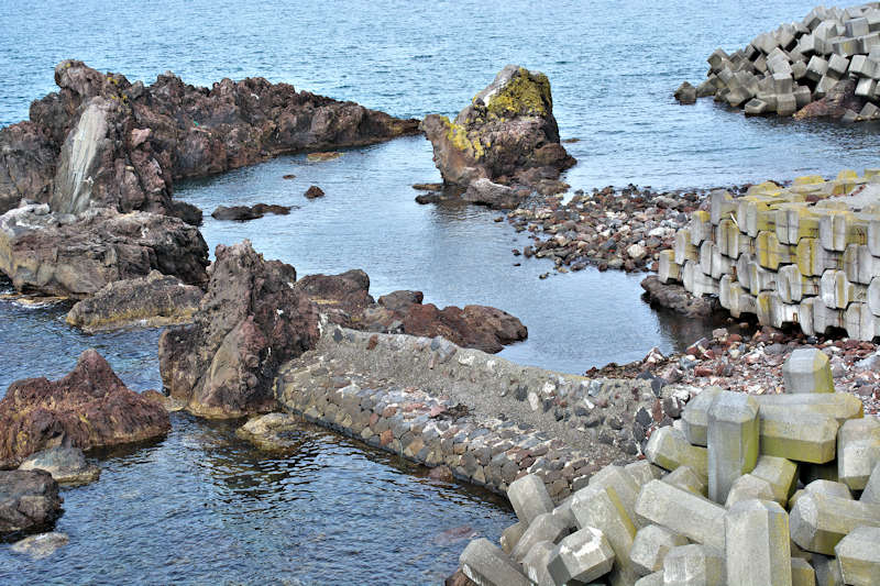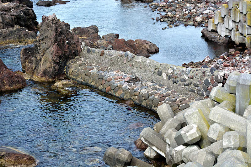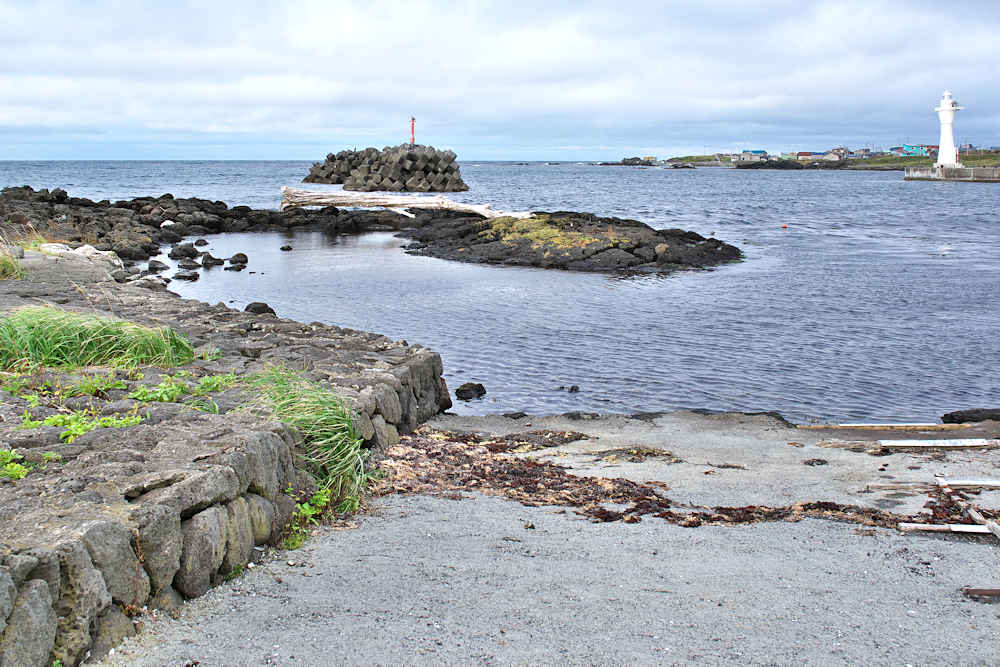 仙法志漁港東防波堤基部でバス停「ほのぼの荘前」にある船揚場に石積堤の一部が残っている。堤体の形から澗の全体像を窺うことは出来ないが西側には浪けしブロックがありハサミ型の袋澗跡であった可能性が濃厚な印象だった。岩場を利用した堤体の上部は殆ど崩壊、残った一部に布積みのように見える部分もある。◇築年月:不詳 ◇堤構造:見知石布積み? ◇澗利用:船揚場 ◇所在地:利尻町仙法志政泊 ◇G.Maps:45.111846, 141.211679