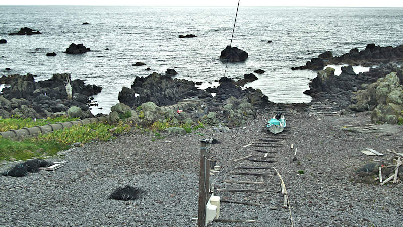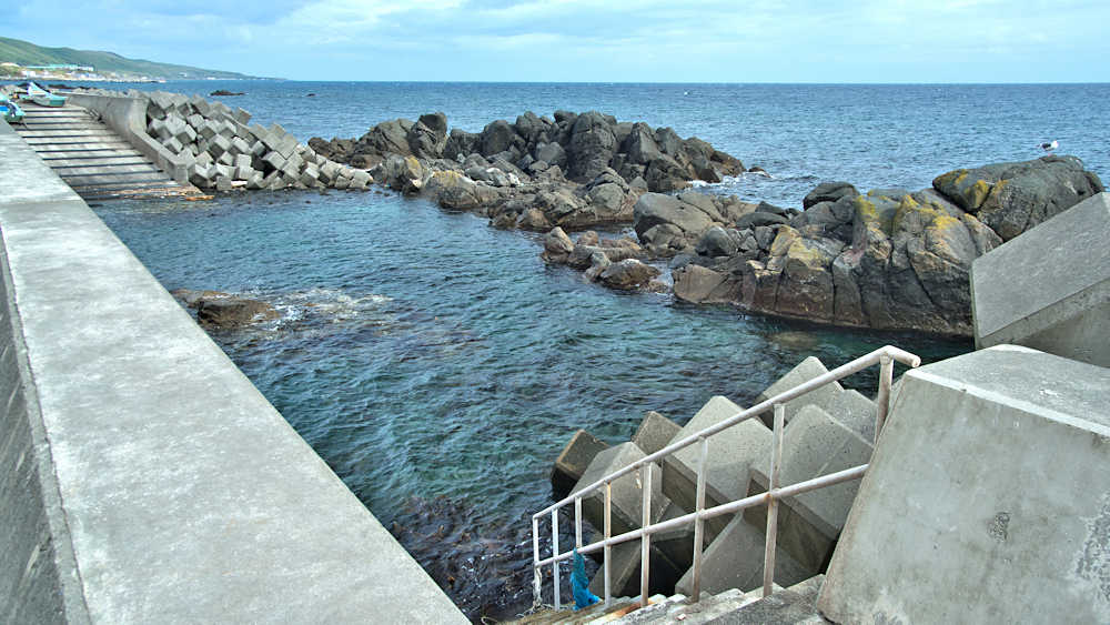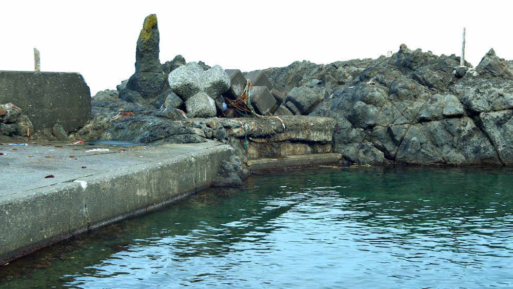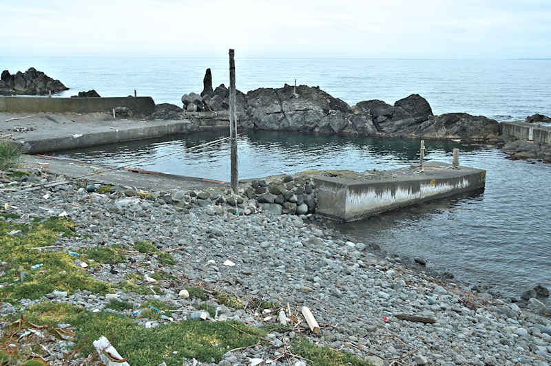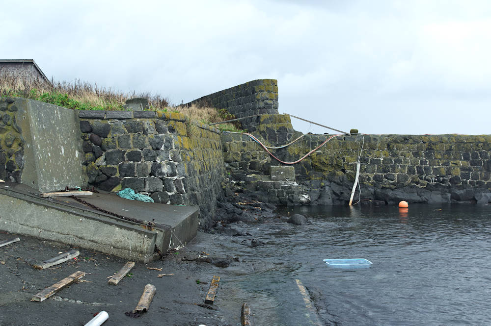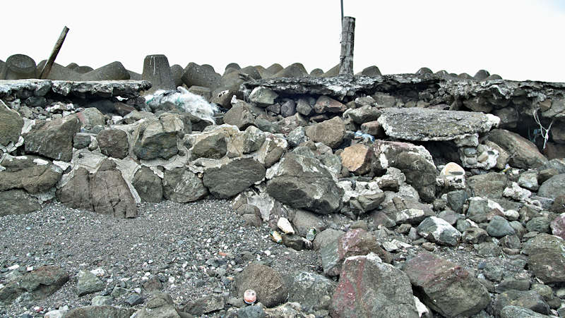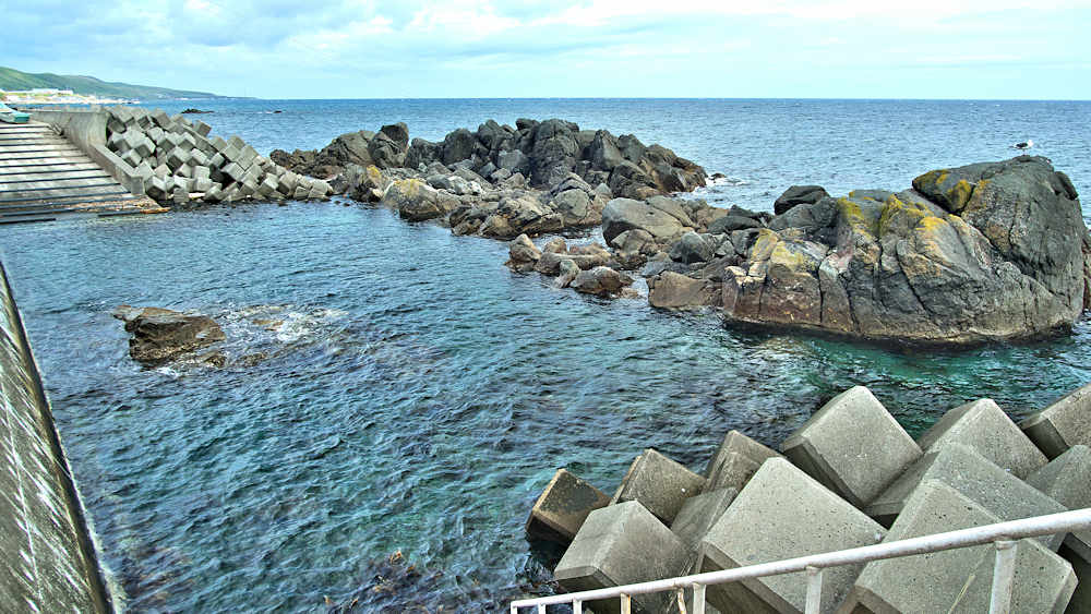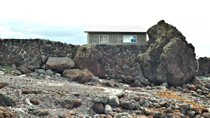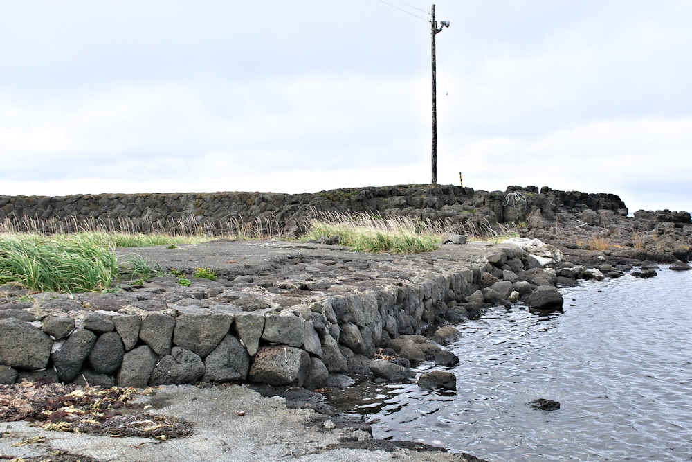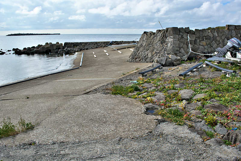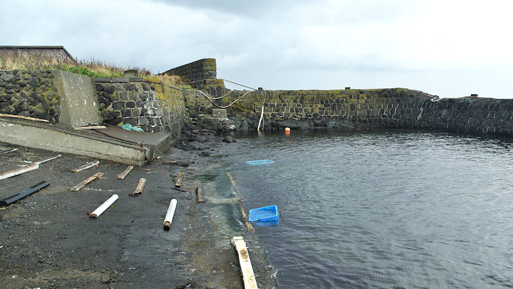仙法志漁港東防波堤基部でバス停「ほのぼの荘前」にある船揚場に石積堤の一部が残っている。堤体の形から澗の全体像を窺うことは出来ないが西側には浪けしブロックがありハサミ型の袋澗跡であった可能性が濃厚な印象だった。岩場を利用した堤体の上部は殆ど崩壊、残った一部に布積みのように見える部分もある。◇築年月:不詳 ◇堤構造:見知石布積み? ◇澗利用:船揚場 ◇所在地:利尻町仙法志政泊 ◇G.Maps:45.111846, 141.211679