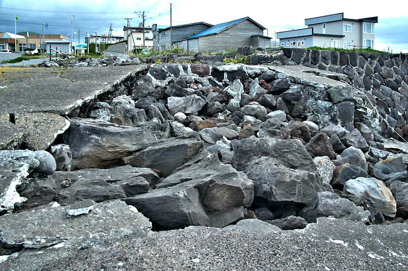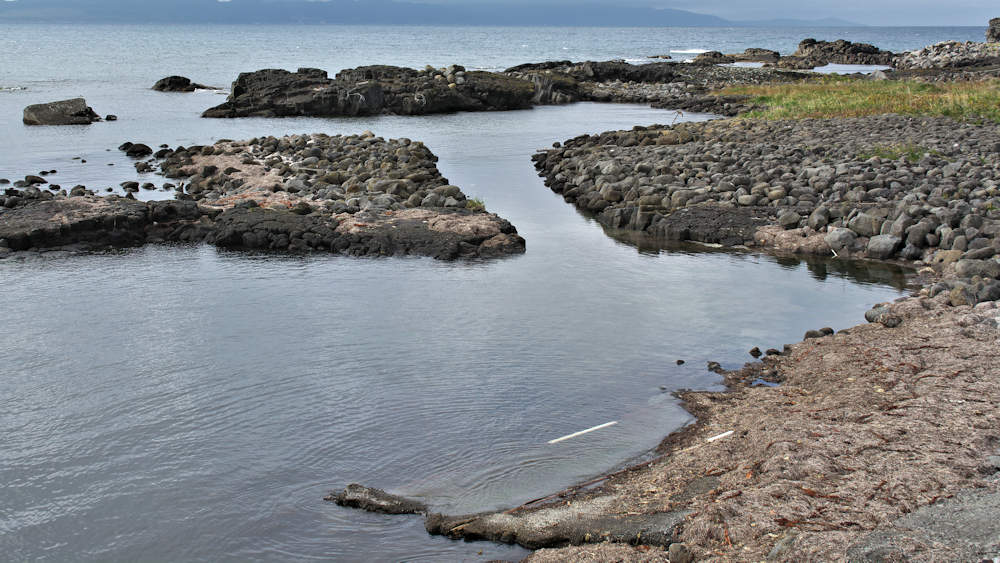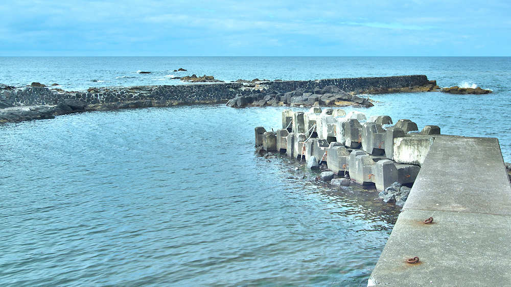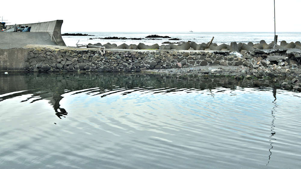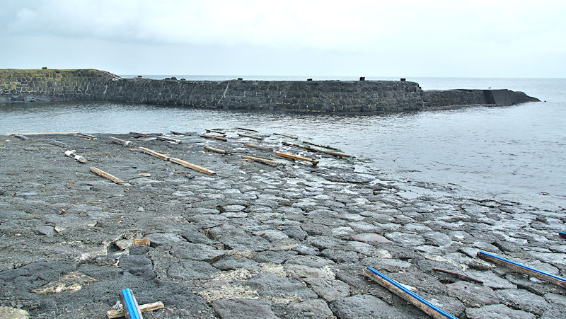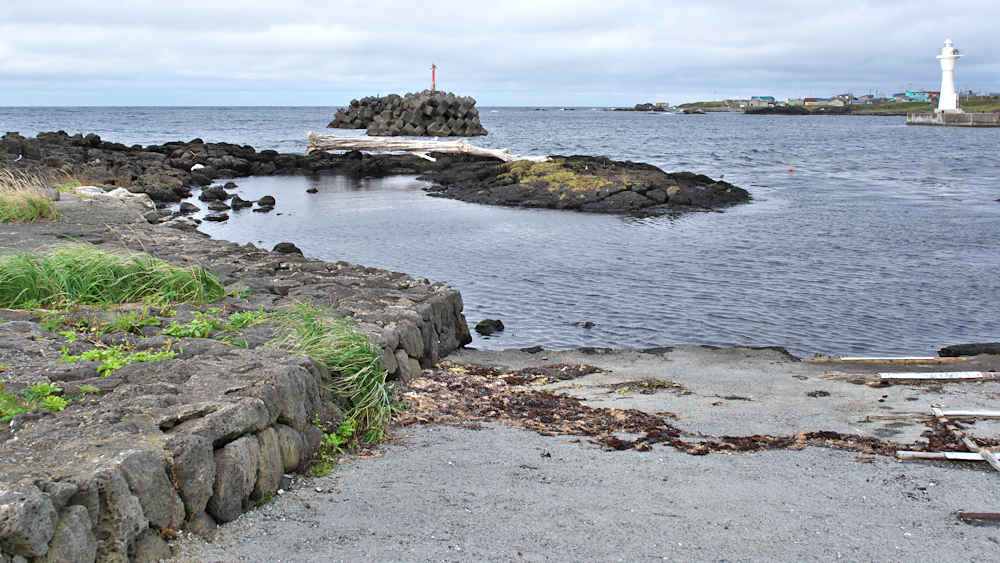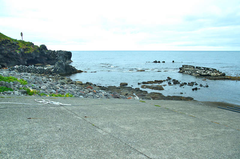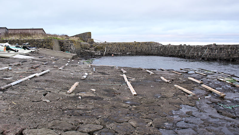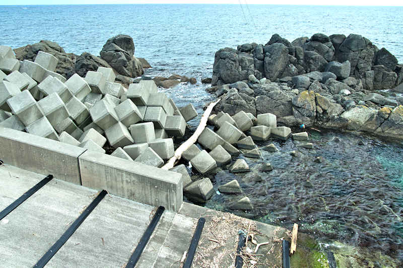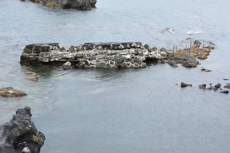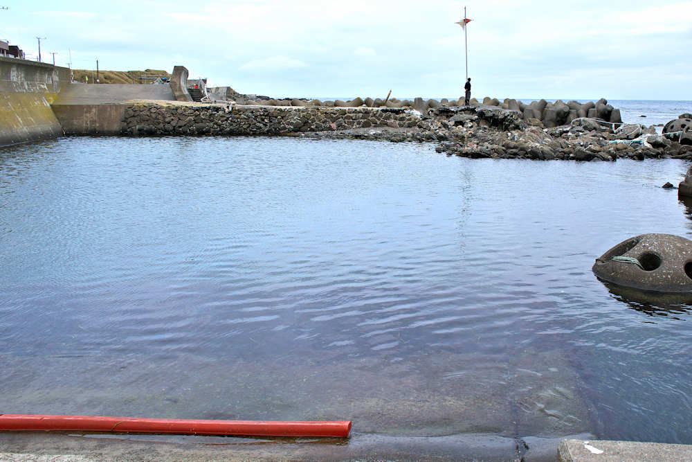 仙法志漁港東防波堤基部でバス停「ほのぼの荘前」にある船揚場に石積堤の一部が残っている。堤体の形から澗の全体像を窺うことは出来ないが西側には浪けしブロックがありハサミ型の袋澗跡であった可能性が濃厚な印象だった。岩場を利用した堤体の上部は殆ど崩壊、残った一部に布積みのように見える部分もある。◇築年月:不詳 ◇堤構造:見知石布積み? ◇澗利用:船揚場 ◇所在地:利尻町仙法志政泊 ◇G.Maps:45.111846, 141.211679