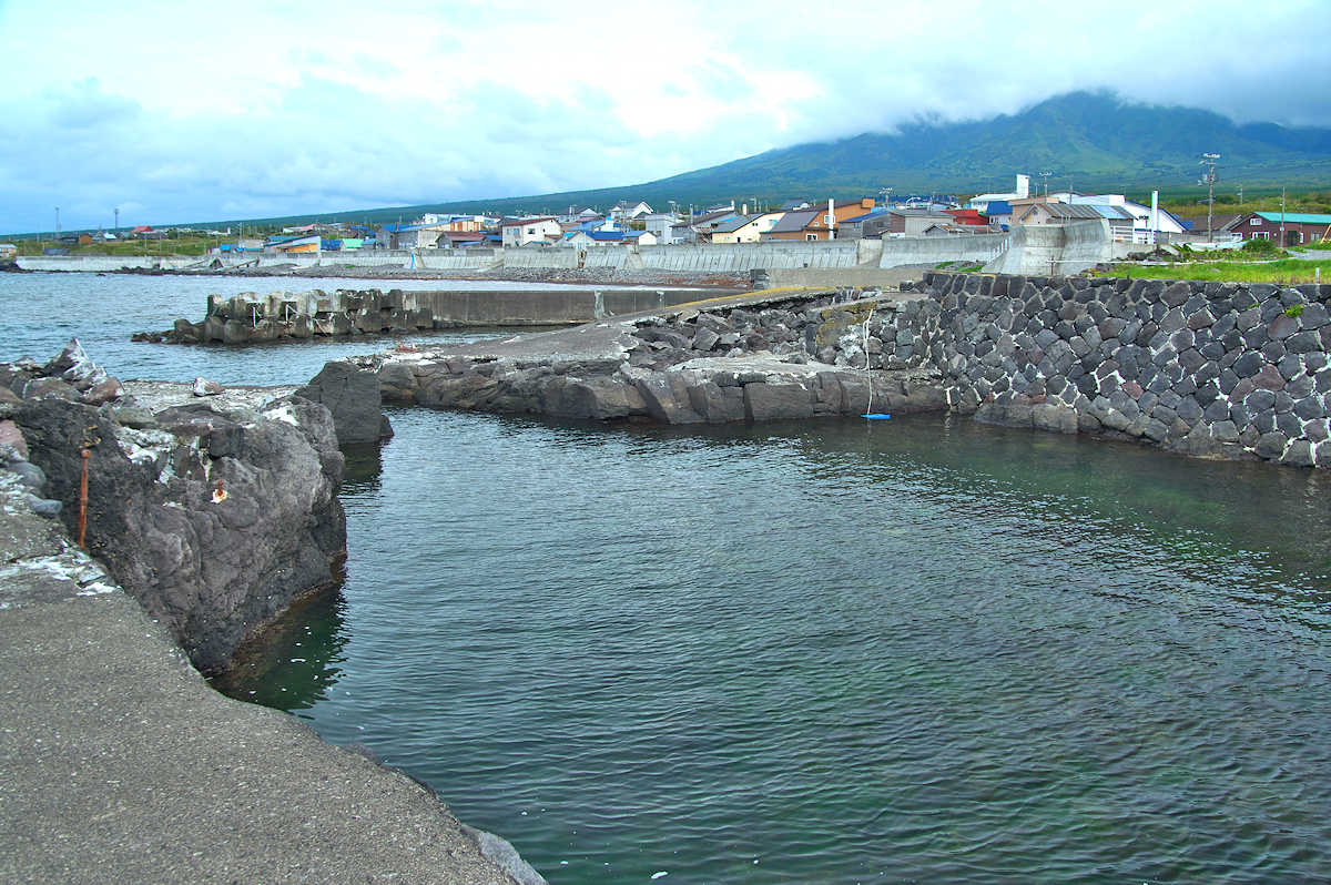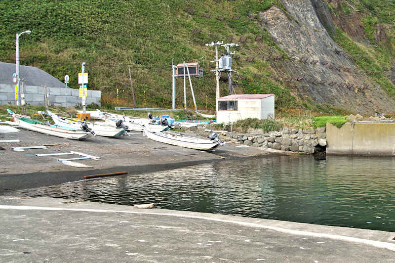 新湊漁港栄浜分港の両脇に切澗があるが核心部分は漁港に変わっていて、袋澗を連想出来る規模の切澗ではないが漁港を含めて袋澗として機能していた可能性はある。北側のホロフンベには航空写真で見る限り袋澗を想像できる澗が2ヶ所ほどみえるが、アプローチが徒歩か自転車限定となりパスしている。おなじホロフンベでも車でいける「北のカナリアたち」ロケ地近くの湾では、船揚場や石垣はあるも堤体などは痕跡はなかった◇築年月:不詳 ◇澗利用:無利用 ◇所在地:利尻町沓形栄浜 ◇G.Maps:45.219648, 141.138530