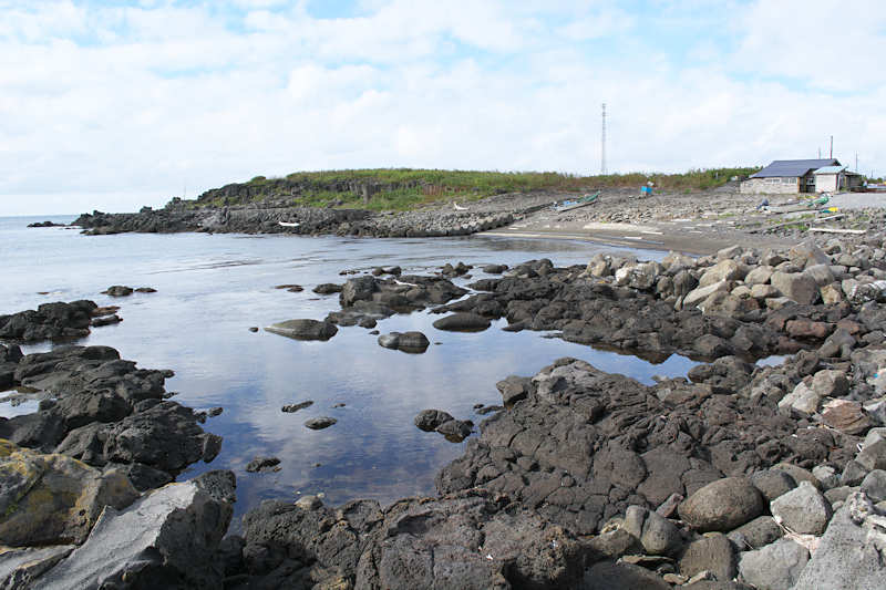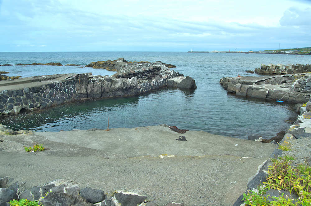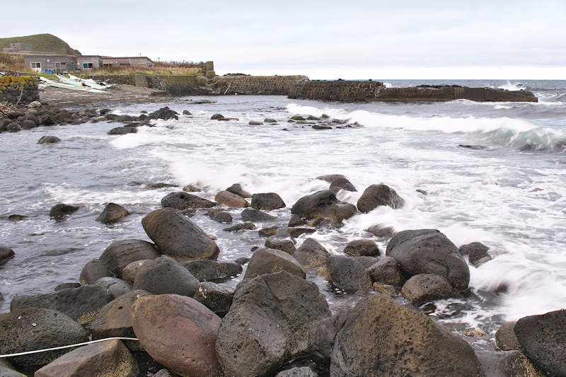 船泊漁協の体験センター北側にある船揚場で防波堤の一部が石積堤をコンクリートで補強し再利用、沖側の岩場に堤に使用したと思われる石が少し残っていた。元々は切澗のようで北側への水路はコンクリートやテトラポットで塞がれているが、漁協前の切澗と合わせると袋澗として十分な広さがあり、袋澗が小漁港として再利用したものか。◇築年月:不詳 ◇澗利用:小漁港 ◇所在地:礼文町香深村キトウス ◇G.Maps:45.373524, 141.059484