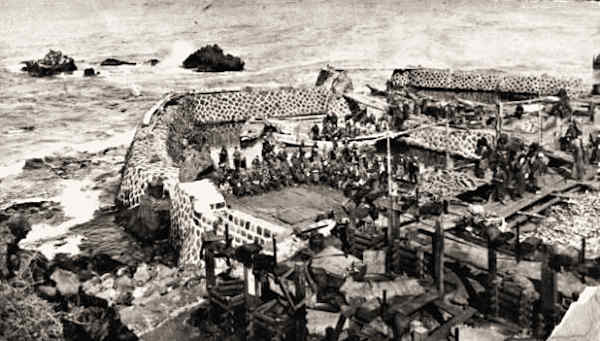 利尻島最大の鯡漁場経営者であった平田豊作は明治26年に鬼脇に来て海産仲買商となり、31年仙法志に移り昭和7年まで久連一帯に10ヶ統の漁場を開いたという。平田兵助が大正期に九連の人面岩横に建造した大型袋澗跡の一部が残るが、全盛時の写真を見ていなければ袋澗の形は想像もできないでしょう。袋澗の東側堤体が崩壊してなくなった岩に鉄筋が見えているが、地元の方は「鉄筋は堤が破壊され修復の時に使ったもので最初から使用したのではない」と。中央の堤は基部が崩壊しているが先端部が天端も含めて残存し形状は巻き天端のようで亀張りというが西側の堤は痕跡もない。主に間知石練積みのようですが残った堤体が極一部なので確定的なことは云えません。利尻町博物館に平田の澗(袋澗)が全盛だった頃の写真を展示されている。◇築年月:大正年代 ◇堤構造:間知石練積 補強に鉄筋使用 ◇澗利用:船揚場 ◇所在地:利尻町仙法志九連 ◇G.Maps:45.142800, 141.163730