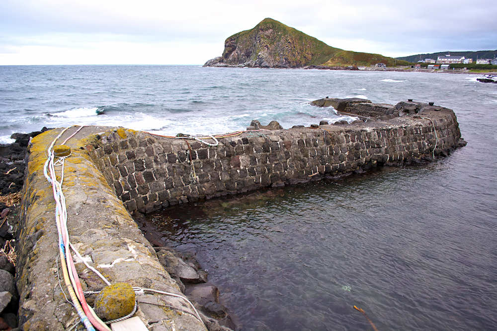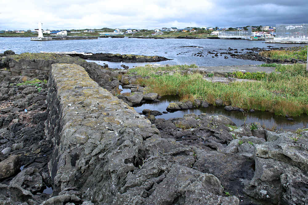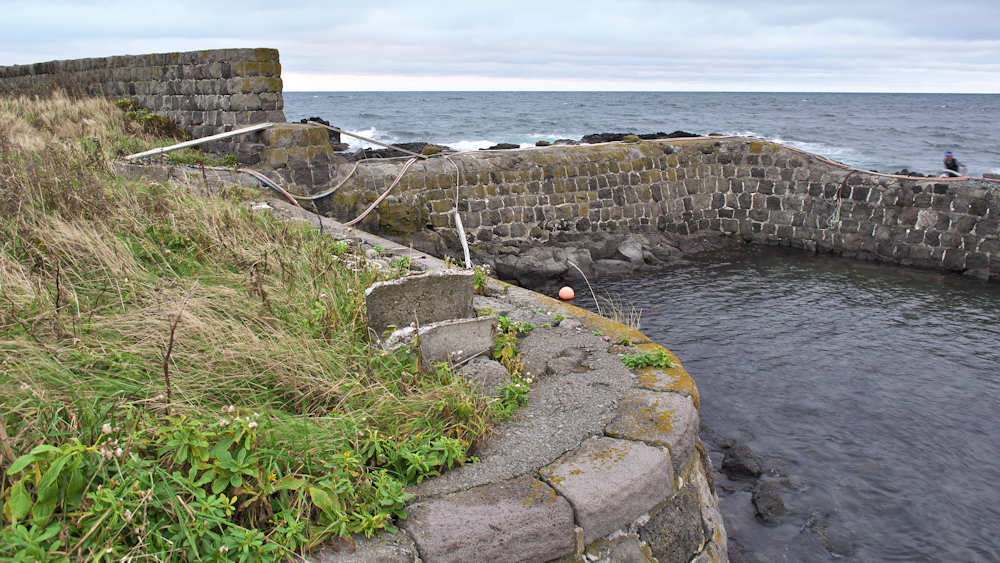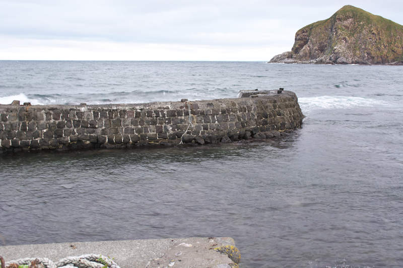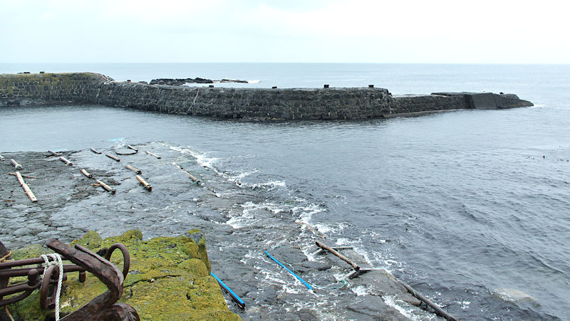 利尻島にはかつては35ヶ所あったと記録に有るそうだが、泉の澗は今もその面影を良く残している。「泉の澗」は元々の岩場地形に沿った形の袋澗で築造年代は大正期以前と考えられているようだ。明治初期の柳谷漁場~大正後期の吉田漁場~昭和の泉漁場という変遷で最後の漁場経営者が泉八三郎氏だった事から「泉の澗」と呼ばれているが、堤体の形状から「泉のナマコ」という別称もあり巻き天端のように見えた。堤体は手カギ状を呈し総延長は約67m、高さは根本部分で3m以上、浪の影響が強い先に行くほど幅広になって高さは低くなり、堤の中間部から先の天端部はコンクリートで補強されている。堤体は間知石練積工法が採用され継ぎ目が白く見えるのが綺麗、大型間知石の布積み最大で七段、堤体上に船掛り用の係船柱が数カ所みえ、北側には同じ工法で築かれた幅36mの石垣があり、石材は利尻産と考えられている。堤体の外側には消波ブロックが投入され、平成13年に利尻富士町が一部補修した現役の船澗で保存状態は道内に残る袋澗としては最もよい。道内に残る保存状態の良い袋澗はいずれも現役の船澗や小漁港というのが共通している。セイコウマートの裏側でニュー利尻ホテル前に入口がある。◇築年月:大正年代以前 ◇堤構造:間知石練積、布積 ◇澗利用:船揚場・小漁港 ◇所在地:利尻富士町鴛泊 ◇G.Maps:45.247927, 141.220666