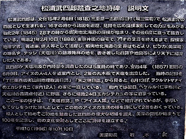 道の駅~びふかの後方の美深森林公園びふかアイランド内にある『びふか温泉』のほぼ正面でキャンプ場入口脇に矢立を模したのか筆の形をした「松浦武四郎踏査之地」碑、その左側には本を開いたような御影石があり左右にそれぞれに1首が刻まれていた。 “ゑみしらは 筍にもる飯も 古のさまを つたへて葉椀にぞもる” “かきならす 五つの緒ごと 音さえて 千乙の思いを われもひきけり”; ◇以下は銅板の「松浦武四郎踏査之地 説明文」より転載。「松浦武四郎は文化15年2月6日(1818)三重県一志郡須川村(現三雲町)で、松浦圭介の四男として生まれる。16才の時から諸国を遊歴、見聞を広め探検家としての力量をみがき、弘化2年(1845)28才の時から蝦夷地北海道の探検が始まり、その後6度に亘って踏査している。明治12年(1888)東京神田の自宅で、71才の生涯を終えるまで、探検家、地理学者、著述家、俳人等として活躍し、蝦夷地北海道の全容はもとより、ピウカ(美深町)の地名やテッシ(天塩川)の語源発祥の地を、書き著した日誌や地図等により天下に紹介した人である。武四郎が天塩川及び内陸部を調査したのは5度目の時で有り、安政4年(1857)旧暦の6月9日、アイヌの人4人を道案内とし、二隻の丸木船で天塩を出発した。当時の記録を「丁巳東西蝦夷山川地理取調日誌」「天之穂日誌」から見るとヲクルマトマナイのエカシテカニ(家内12人)の家に一泊している。町内では翌日、ヘケレル(仁宇布川と天塩川の合流点」に野宿、さらに帰路24日エカシテカニの家に泊まっている。この一家の様子は「天塩日誌」や「アイヌ人誌」などで紹介されているが、手厚いもてなしを受けた謝礼として、この地のアイヌの生活の様子を詩にして2首おくっている。和人として初めてこの地を踏査した武四郎の偉大な功績を讃え、美深の開拓が始まって100年を記念し、町の文化史跡としてここに詩碑を建立する。平成10(1998)年10月10日 美深町長 岩城 実」と記されている。一部ヲクルマトマナイの碑文と重なるので以降は省略する。※ここでいう「アイヌ人誌」は「近世アイヌ人物誌」のこと、宿営地はここからR40を北上した恩根内にある。◇所在地:美深町紋穂内 森林公園びふかアイランド内