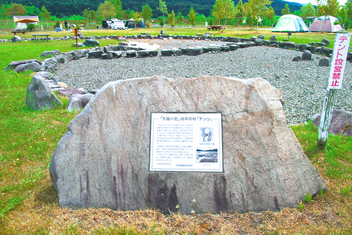 説明文より「安政4年(1857年)旧暦6月14日、松浦武四郎は幕府の命を受け天塩川流域調査のため、アイヌの人を道案内にこの地を訪れ「大昔に神が作り並べた」というアイヌ伝説の通り川の中に一条の岩が並んでいる様子を見て「天塩川名」の由来「テッシ」(アイヌ語で魚をとる仕掛け梁のある所の意)は、この場所の地形が語源に間違いないと「天塩日誌」に書き残しています。美深町は、松浦武四郎の探検家としての偉大な業績を称え、「天塩」の語源発祥の地である史跡「テッシ」を昭和58年10月6日、美深町文化財に指定しました。びふかアイランド整備に合わせ、集う人々の憩いの場に1/10縮尺にて復元し、由来の地「テッシ」を後世に伝えることにしました。平成10年10月10日」説明板には松浦武四郎の肖像とテッシの写真が載っている。天塩日誌には「本名テシウシなるを何時よりかテシホと語る也。テシは梁の事ウシは有との意なり。此川底は平磐の地多く、其岩筋通りて梁柵を結し如く、故に号しと」この地形が「天塩」の語源になっていると当時の記録に残している。ここでは魔神が梁柵を作りサケを捕ることをアイヌに教えたという話も残されている。木材の流送や船用に掘削され目立たなくなっているが水量が少ない時は恩根内大橋から「テッシ」が見える。◇所在地:美深町紋穂内 森林公園びふかアイランド内 せせらぎ水路
