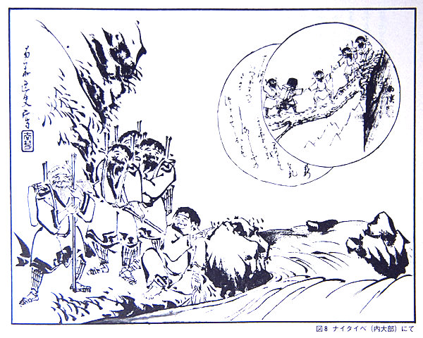 所在地は先の松浦武四郎宿営地・サッテクベツを参照。「サッテクベツ・天塩川歴史紀行」には6月21日目(調査16日目)と6月19日(調査19日目)の様子と舞に興じる人達の武四郎絵、オヒョウの樹皮を剥ぐ人たちの絵、イナウの種類が載っている。最初は6月21日目(調査16日目)より1部転載「前略・・さてここからは川の流れが幾筋にもなっている上に、流木や倒木が多いので四苦八苦しながら船を進める。オンネトを過ぎてサッテクベツについた。この岸に天塩から同行したアエリテンカの家がある。彼らの妻たちはちょうど楡皮(おひょうの樹皮)をはいだり、草の根を掘ったりしに山に出かけていて留守であった。そのそばにルヒサンケの家もあったが、そこも留守だった。」この時はトセツとアエリテンカが武四郎に同行している。6月19日(調査19日目)より転載「パンケヌカナンを過ぎて、昼頃にサッテクベツに着くと、大勢のアイヌたちが集まって私をもてなしてくれた。この前に仕込んでおいた酒をこしたりイナウを削ったりして、それを山や海の神、先祖の神々に供えて祭った。さらにメノコ(女性)たちがムックリという口事を鳴らし、男たち一同は胸を打ち、足ぶみをして舞い始めた。何とも古風で仰々しく見事であった。」武四郎は踏査の道中悲しい話を聞き無情の様を見て来たが、初めて楽しそうな様子を見たと日誌に書いた。平成26年頃設置◇所在地:士別市中士別