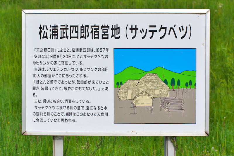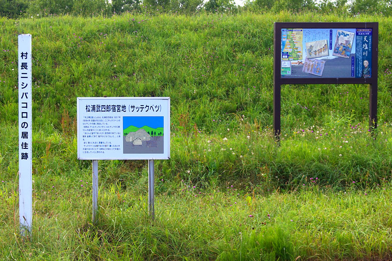 サッテクベツの宿営地には国道40号を名寄方向に進み、大通り北3で右折し九十九橋を渡り、1つ目の信号を右折、約600m直進してワッカウエンベツ川にかかる境橋を越え右折。約100m先の天塩川堤防下の水門近くに士別市郷土史研究会が平成9年に設置した説明板が有り、国道40線から車で約10分程。ここには「松浦武四郎宿営地 サッテクベツ」「天塩川歴史紀行」「村長ニシパコロの住居跡標柱」があるが個別に紹介(部落はコタンに変更)します。説明板より『天之穂日誌』によると松浦武四郎は、1857年(安政4年)旧暦6月20日に、ここサッテクベツのルヒサンケの家に宿泊している。当時は、アエリテンカ、トセツ、ルヒサンケの3軒10人のコタンがここにあったとされる。「ほとんどは留守であったが、武四郎が来ていると聞き、皆帰ってきて、賑やかにもてなした。」とある。また帰りにも泊り、酒宴をしている。サッテクベツは痩せる川の意で、夏になると水の涸れる川のことで、当時はこのあたりで天塩川に合流していたと思われる。」駐車スペースは一台分程度。村長ニシパコロの住居跡標柱・説明板・天塩川歴史紀行説明板もある。◇所在地:士別市中士別