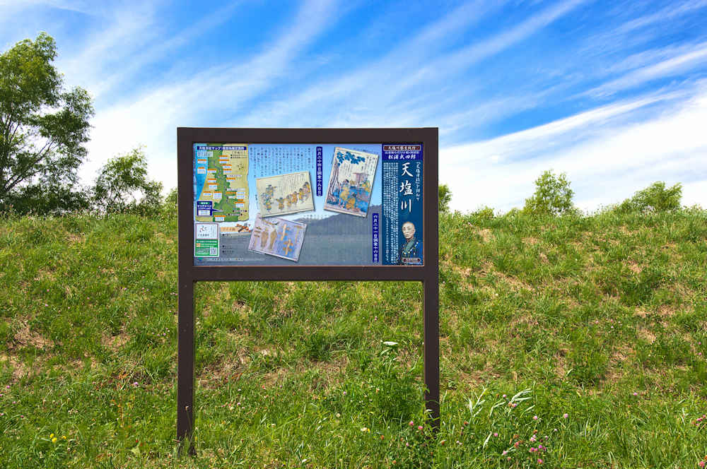 国道239号を走り、JR宗谷線の陸橋を渡って1本目の交差点を右折。道道976号(西風連士別線)を北上して下北大橋手前の交差点を左折。さらに右、左と曲がって剣淵川堤防に上がると前に士別市郷土史研究会が平成9年に設置した説明板が見える。以下は説明板は『天之穂日誌』より引用して説明している。『松浦武四郎は、1857年(安政4年)旧暦6月19日に、ここリイチャニのニシハコロの家に宿泊している。「その家は誰も住んでおらず、屋根も腐れていたので、そのそばに野宿しょうととしたが、蚊が多くて食事もできない始末。しかたなく家にはいり、火を燃やして泊まったが、明け方前に雨が降り出し、滝のような雨漏りにどうしようもなく、すぶ濡れになってしまった」とある。武四郎は次の日、剣淵川を50街余り上がって大体の地形を見て、合流点へ引き返している』すすだらけの雨水でずぶ濡れとはあまりにも気の毒と言うしかないが、天塩日誌にはこの辺りの乙名ニシハコロの家に家に泊まるとあるだけ。剣淵川を50町ほど遡りとあるのでイヌシベツ合流部より少し上流の12線橋付近まで行って引き返したようです。 リイチャニの宿営地跡にたどり着くのは面倒で初めての人は大変かもしれない。ここにも「天塩川歴史紀行」板を設置予定と聞いたが、説明板はもう少し目立つ場所にしてほしいが・・・◇所在地:士別市北町 剣淵川堤防際