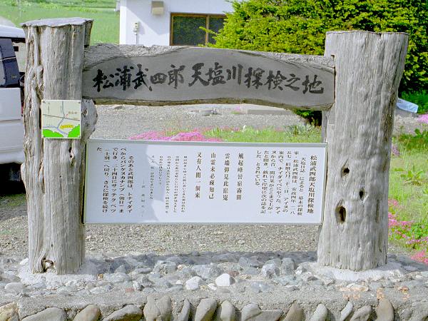 士別滝上線の西内大部川にかかる更生橋の間近に士別市郷土研究会が昭和42年に設置した「松浦武四郎天塩川探検之地」碑があるが、風化が進み題字部分は殆ど判読不能なので写真は新旧で掲載。松浦武四郎一行がサッテクベツから天塩川上流へ向かいナイタイベ(西内大部)で進退窮り、引き返すかどうか悩んでいたが、此処に偶然にもアエリテンカの妻がいて『大木が倒れているからそれを渉るように』と教えられ、ナイタイベより陸行で上流のペンケヌカナン迄行きそこから山に登って天塩岳をみたと「天塩日誌」に書いた。また山奥で偶然とはいえ妻と出会ったアエリテンカの喜ぶ様も天塩日記に残してしている。「丁巳日誌」によるとトナイタイベ(東内大部)川との合流部より5~600mほど上流側に進むもその先に進めず、現在のパンケ橋付近(当時の川とは変わっている)で引き返したようだ。トナイタイベ(東内大部)にて仮小屋に(6月21日)泊り翌日サッテクベツに戻る。以下は説明板より転載。「天塩日誌によると、幕末の探検家・松浦武四郎は安政4年(1857)旧暦6月22日、アイヌの案内でナイダイベに至った。アイヌから昔、間宮某がここまで上がったと聞き、戯れて岸壁に次の誌を記したとされている。 風起峰巒宿霧開 雲端仰見此崔嵬 山霊未必疎知己 又有人間一個来 風がおきて峰々纏い着いてきた霧は払われ 雲間から此の素晴らしい岩山が仰ぎ見えました 山の心霊は未だ先に訪れた知人(間宮林蔵)をお忘れではないでしょう 又一人(私)が訪ねてまいりました。訳 北村大三 そのあと武四郎はトナイダイベからパンケヌカナンプ(朝日)まで行き、24日にサッテクベツ(士別)に戻り、さらに探検を続けた。」脇道にそれるがナイダイベは蝶鮫の事らしいが松浦武四郎の記録で蝶鮫が出てくるのはシュボロ(名寄)迄だが蝶鮫がここまで上がったのだろうか?ここにも「天塩川歴史紀行」を設置予定とか。◇所在地:士別市上士別町25線 更生橋付近