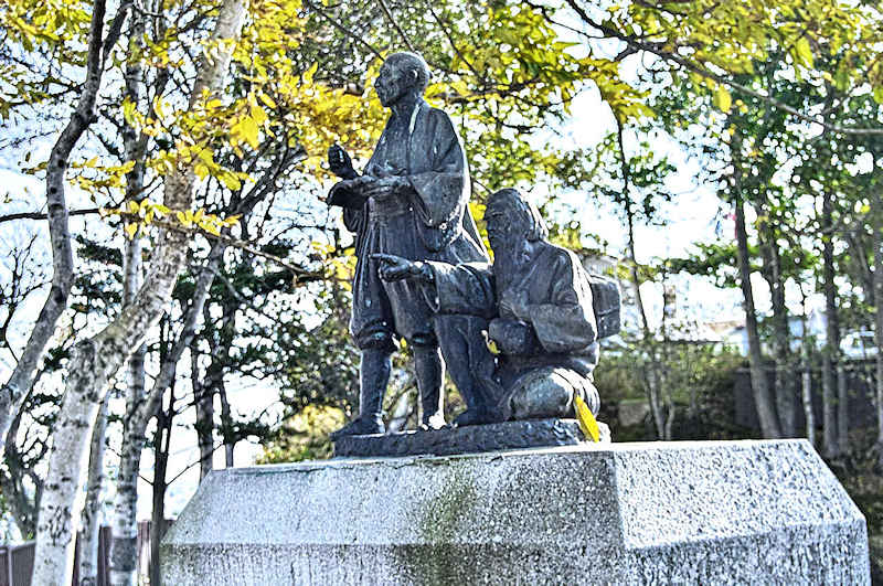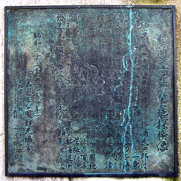 松浦武四郎の像は小平町、天塩町、釧路市の三箇所に有るが幣舞公園のが一番古い。台座正面にある銅板の碑文に「松浦武四郎蝦夷地探検像」に続けて「北海道及び釧路の名付け親、松浦武四郎は幕末に未開の蝦夷地探検の急務を説き一身を賭して苦難と闘いアイヌ民族の協力を得て東西蝦夷地山川地理取調等蝦夷地開拓計画の基礎資料を作成し為政者に供して諸種の献策を行いその促進をはかる。安政5年(1858年) 阿寒国立公園地帯を探査して久摺日誌を記述せしより百年目にあたりクスリ酋長メンカクシの砦跡たりしサウシチャシコツに像を建て北海道開発先駆者阿寒の父として永えに顕彰せんとするものである。昭和33年(1958年) 阿寒国立観光協会 釧路市公民館長丹葉節郎撰 北海道学芸大学教授山口野竹書」と記してある。像の制作者は中野五一氏、平成6年にチャシ跡という公民館小広場から幣舞公園に移転されたという。運上屋の城下町である釧路に運上屋に抗してアイヌの擁護者であった松浦武四郎の像が有るのは意外な印象だったが、碑文をみると武四郎が阿寒の地を調査し景勝を紹介した功績をたたえ、北海道の開拓と阿寒国立公園の父として阿寒国立公園観光協会が顕彰したのであった。是が当時の松浦武四郎に対する一般的な評価であったのであろう。ただ気になるのはメンカクシと思われる人物像が座っていること、旭川の風雪の像も同じで何となく印象がよくない。◇釧路市幣舞公園