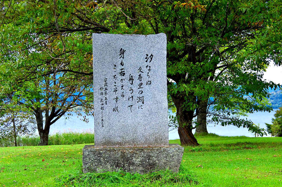 ビジターセンターからボッケに向かって遊歩道を進むと坂を少し下った右側に松浦武四郎漢詩碑があり、釧路らしく啄木の歌碑も有る散策コースになっている。説明板には「松浦武四郎 江戸時代末期北海道中に足跡を残した探検家です。安政5年(1858年) に阿寒湖畔を訪れており、著書の「久摺日誌」のなかで阿寒の豊かな自然について記しています。」とあるだけで漢詩の説明は無く手元に「久摺日誌」でも無ければお手上げかも。“水面風収夕照間 小舟撐棹沿崖還 忽落銀峯千仭影 是吾昨日所攀山 安政戊午三月廾八日即作 松浦竹四郎源弘□ 桂山書”とあるようですが、丸山道子・現代語訳「久摺日誌」に漢詩の解説がある。武四郎の漢詩碑は他には知らないが、岩見沢市北村で碑文に七言絶句が刻まれた碑をみている。碑は釧路北三國有志代表 世話人 佐々木米太郎により昭和16(1941)年に建立されたが説明板でも無ければ読めそうにない。ここでは釧路らしく啄木の歌碑も有る散策コースになっている。◇釧路市阿寒町 阿寒湖畔ボッケ遊歩道