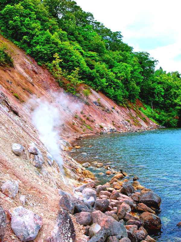 武四郎一行は安政5年4月6日に清里町清泉から清里峠を越え、ケネカ川源流から摩周の外輪山に登り反時計回りに外輪山をほぼ一周。ヨロウシと呼ばれた所から摩周湖畔に下りホロと呼ばれた大洞窟に一泊、翌日は西別岳を通り西別川上流のコトンナイに抜けた。久摺日誌で湖畔に下る様子を「左の方湖辺を指して下る(凡八丁)。是神岳の東の方なり。ヨロウシと云るなり。此処神岳の山根高数千仞掌を立し如く、木幣を作り立て拝す。小の磯は岸皆赭石の礁たるなり。依て其水辺浅き所は血を流せしが如し(三丁)。行てホロとて大岩窟の高さ一丈に巾弐丈も有、入る事五六間にて又内広く二ッに分れ其奥に幽邃にして知り難し。是を雌雄の神と云」と記している。赤い岩壁で衣服などが擦れると赤く染ったという洞窟は、アイヌ達の猟小屋として利用されていたが地震で崩壊し埋まってしまった。クスリ日誌の挿画と写真を見比べてみると今でも降れそうな雰囲気だが立ち入り厳禁区域。◇弟子屈町 摩周湖湖岸