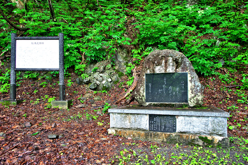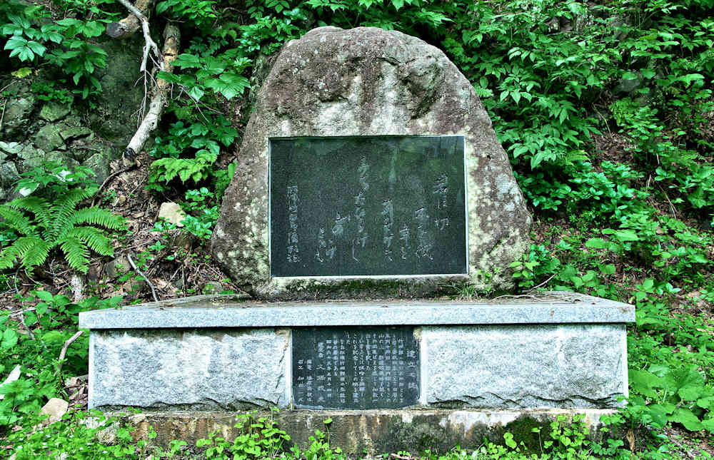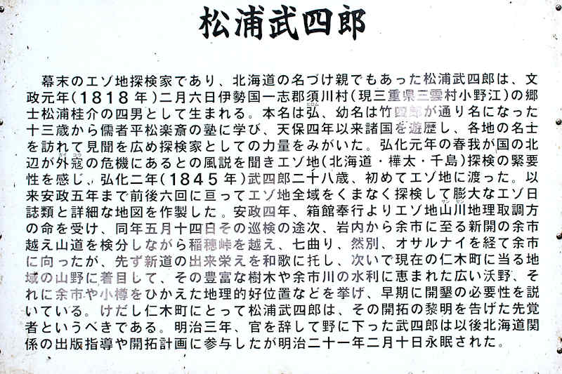 説明板の内容を転載した「幕末の蝦夷地探検家で有り、北海道の名付け親でもあった松浦武四郎は、文政元年(1818年) 2月6日伊勢国一志村(現三重県三雲村小野江) の郷士松浦桂助の4男として生まれる。本名は弘、幼名は竹四郎が通り名になった。13歳から儒者平松楽斉の塾に学び、天保4年以来諸国を遊歴し、各地の名士を訪れ見聞を広め探検家としての力量をみがいた。弘化元年の春我が国の北辺が外寇の危機にあるとの風説を聞きエゾ地(北海道・樺太・千島) 探索の緊要性を感じ、弘化2年(1845年) 武四郎28歳、初めて蝦夷地に渡った。以来安政5年まで前後6回に亘ってエゾ地全域をくまなく探索して膨大なエゾ日誌類と詳細な地図を作成した。安政4年、箱館奉行よりエゾ地山川地理取調方の命を受け、同年5月14日その巡検の途次、岩内から余市に至る新開の余市越え山道を見聞しながら稲穂峠を越え、七曲り、然別、オサルナイを経て余市に向かったが、先ず新道の出来栄えを和歌に託し、次いで現在の仁木町にあたる地域の山野に着目して、その豊富な樹木や余市川の水利に恵まれた広い沃土、それに余市や小樽を控えた地理的好位置などを挙げ、早期に開墾の必要性を説いている。けだし仁木町にとっては松浦武四郎は、その開拓の黎明を告げた先覚者と云うべきである。明治3年、官を辞して野に下った武四郎は以後北海道関係の出版指導や開拓計画に参与したが明治21年2月10日永眠された。」これだけ長い碑文や説明文でアイヌ民族に一言も触れていない武四郎碑も珍しい。安政4年に余市から岩内へ開削された道は、古くはアイヌの人たちが岩内から余市への道として使われていた峠で天候が変わる事が多く、イナウ(木幣)を捧げ無事を祈ったので「稲穂峠」と呼ばれたというが、今はトンネルであっという間に過ぎてしまう。◇所在地:仁木町大江 稲穂トンネル入口手前右側広場上