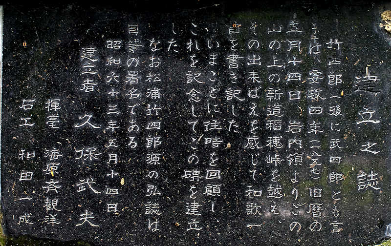 国道5号線を仁木町側から倶知安方面に向かい稲穂トンネル手前で右側広場に入ると看板あり、駐車場の山寄りに新道の見分に訪れた松浦武四郎の歌碑があり、一段下に島義勇の碑がある。歌碑は松浦武四郎の訪地100年を記念し建立されたとも云い、三角おにぎりのような岩に。「岩ほ切 木を伐 草を 苅そけて みちたひらけし 山のかけとも」「松浦竹四郎源弘誌」と刻まれた石盤がはめ込まれ歌が刻まれている。台座の石盤にある「建立之誌」には「竹四郎(後に武四郎とも言う) は、安政4年(1857) 旧暦の5月10日、岩内領よりこの山の上の新道稲穂峠を越え、その出来栄えを感じて和歌を一首書き記した。いまここに往時を回顧し、これを記念してこの碑を建立した。なお松浦竹四郎源の弘誌は自筆の署名である。昭和63年5月14日 建立者 久保武夫 揮毫 海原斉観洋 石工 和田一成」と刻まれている。