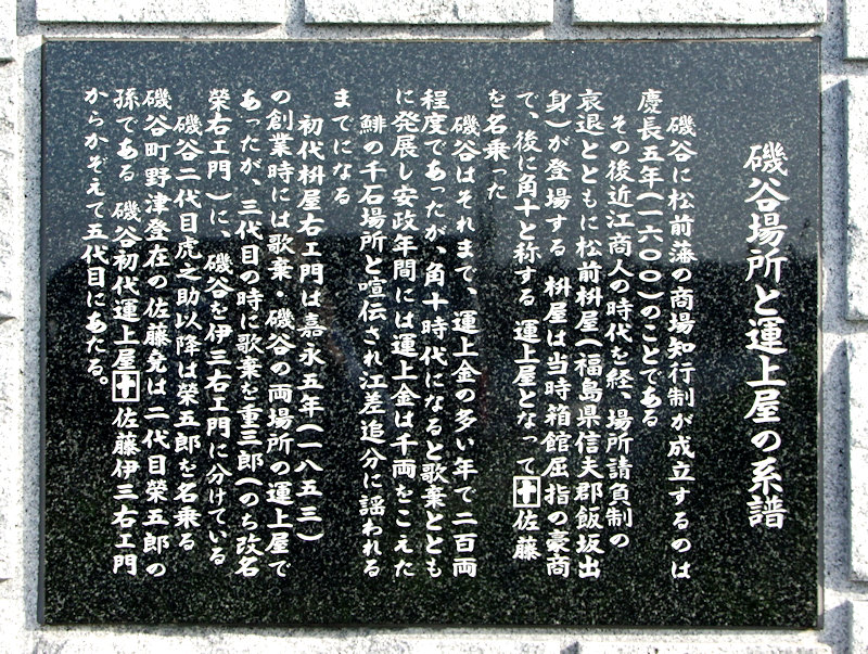 江戸末期には島古丹、歌棄、寿都の3カ所に運上屋があり、磯谷の中心地は島古丹で、江戸時代には旅籠が10軒以上あったという。島古丹の運上屋はのちに横澗(磯谷)に移転、移転先の横澗漁港に横に磯谷場所運上屋跡の碑が建立されている。維新後の場所請負制廃止で運上屋は廃止、駅逓業務は開拓使に引き継がれる。松浦武四郎は『西蝦夷日誌』に島古丹の繁栄ぶりを記しているが、磯谷についても「イソヤ運上屋 本名イシヤウヤにて岩磯岡也。此辺惣て暗礁多きが故に號く。地形後に山有。前ライデン岬に対して湾をなし、海中小嶋有。弁天社を立、船板を以て橋として、其眺望又奇也」と。