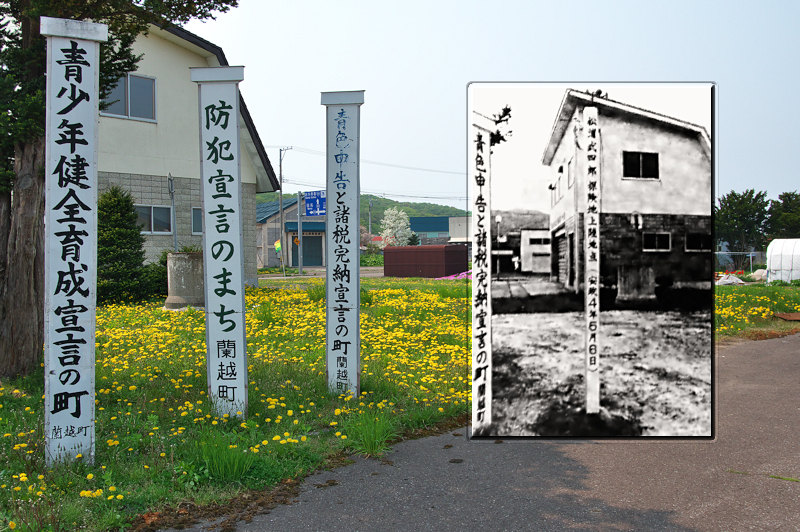 松浦武四郎は三度に渡って尻別川の探索をしているが、安政4年の5月6日に現地のサケノカロ、スイト、五右衛門、甚四郎に先導され二艘の丸木船で尻別川を遡り現在の名駒橋下流付近に上陸し宿営、翌日は石淵付近まで遡るが雪解けの激流とテッシに阻まれ引き返している。標柱は上陸地ではなく誰の目にも触れる場所ということで名駒生活改善センター横に設置したと云うが、標柱は経年劣化で消失し更新もなく標柱跡の窪みが残っているだけ。元々はメナと呼ばれた地域で蘭越でも早くに開けた所で、駅逓や戸長役場もあったがその跡に蘭越発祥の碑がある。写真は現在の場所の写真に碑が建っていた頃の写真(蘭越町郷土研究誌・追録より)を合成したものです。◇所在地:蘭越町名駒町210番地
